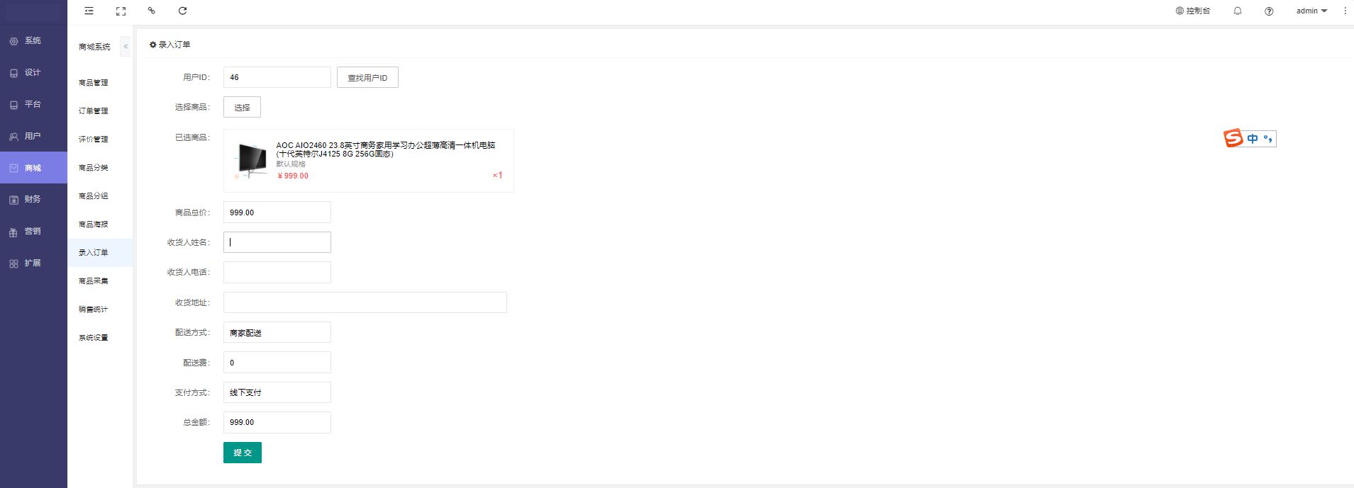 选择会员ID,选择商品,设置收货人姓名,收货人电话,收货地址等信息提交即可
