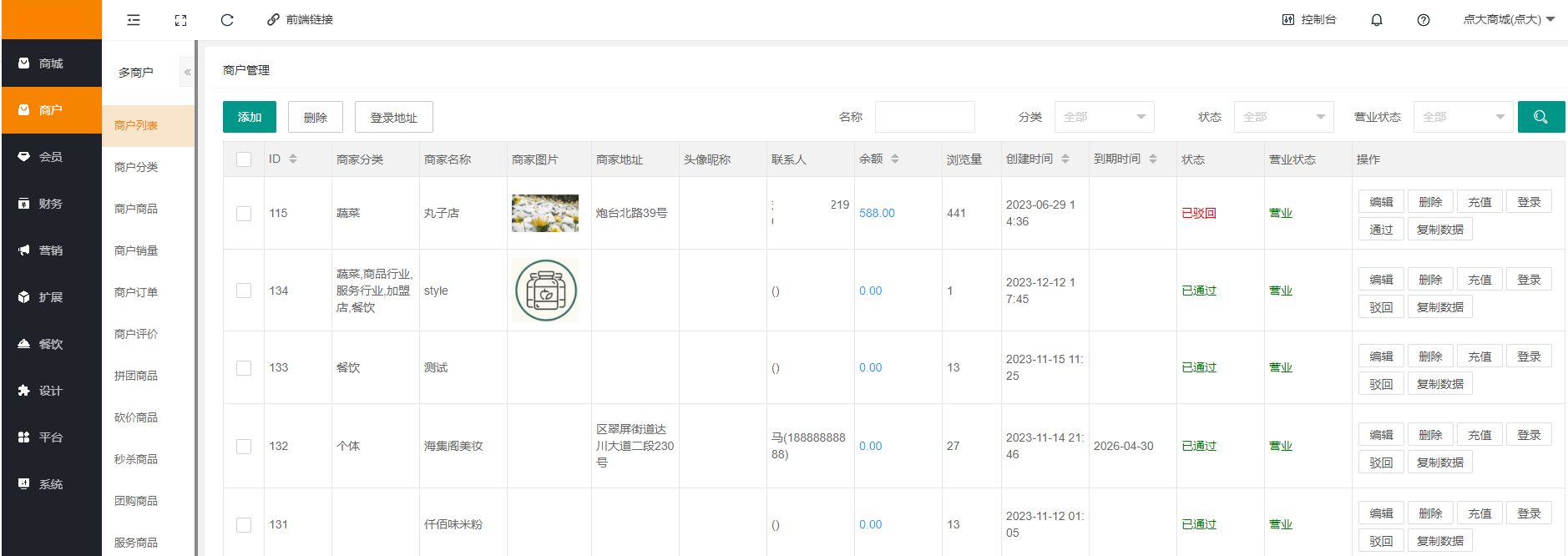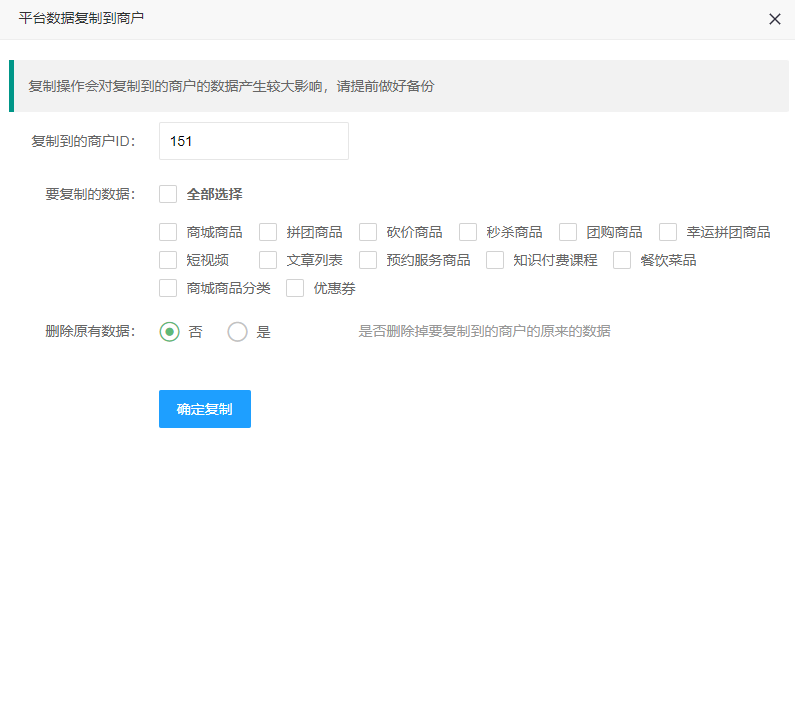 注意:商户列表里的复制数据功能是平台商品复制到多商户,复制操作会对复制到的商户的数据产生较大影响,请提前做好备份