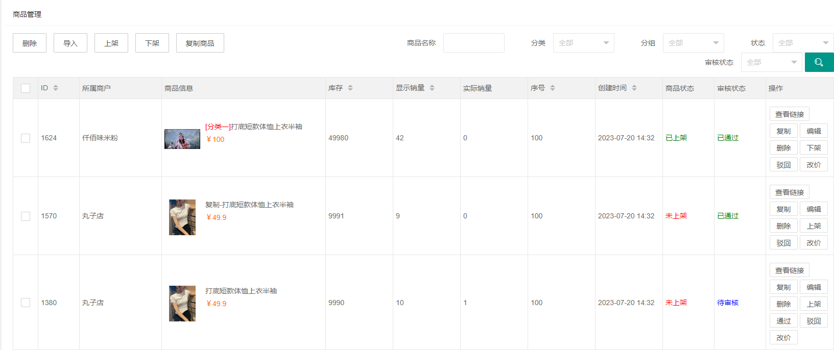 展示各商家的商品,可以进行删除、导入、复制商品、审核、驳回等操作