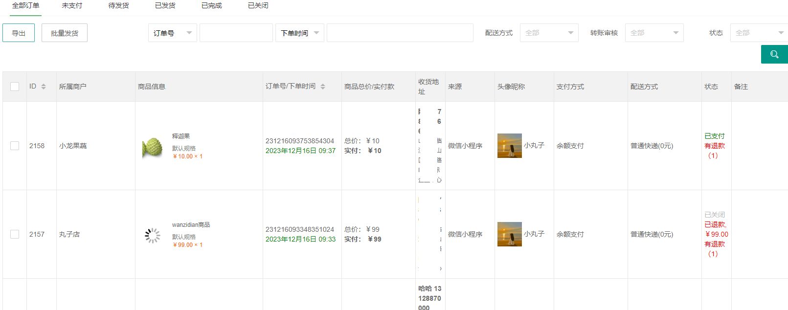 商户订单:记录商户订单,进行订单查看,发货,打印商品单,查看物流,售后等操作
