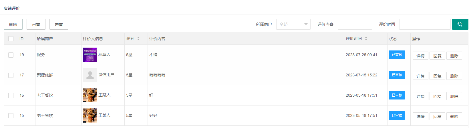 展示多商户的评价,总后台可以审核、回复、删除评价