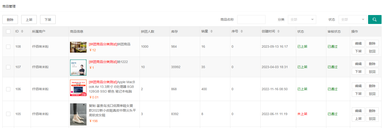 展示多商户的拼团商品,平台可以对商品进行删除、上架、下架、编辑、删除等操作