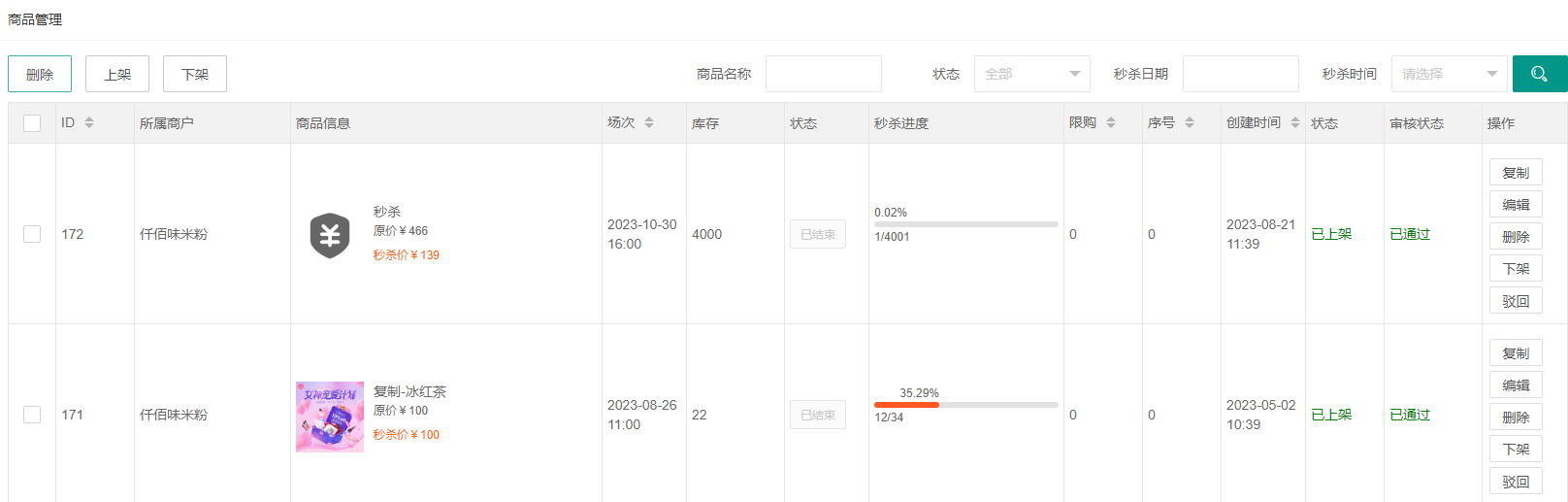 展示多商户的秒杀商品,平台可以对商品进行删除、上架、下架、编辑、删除等操作