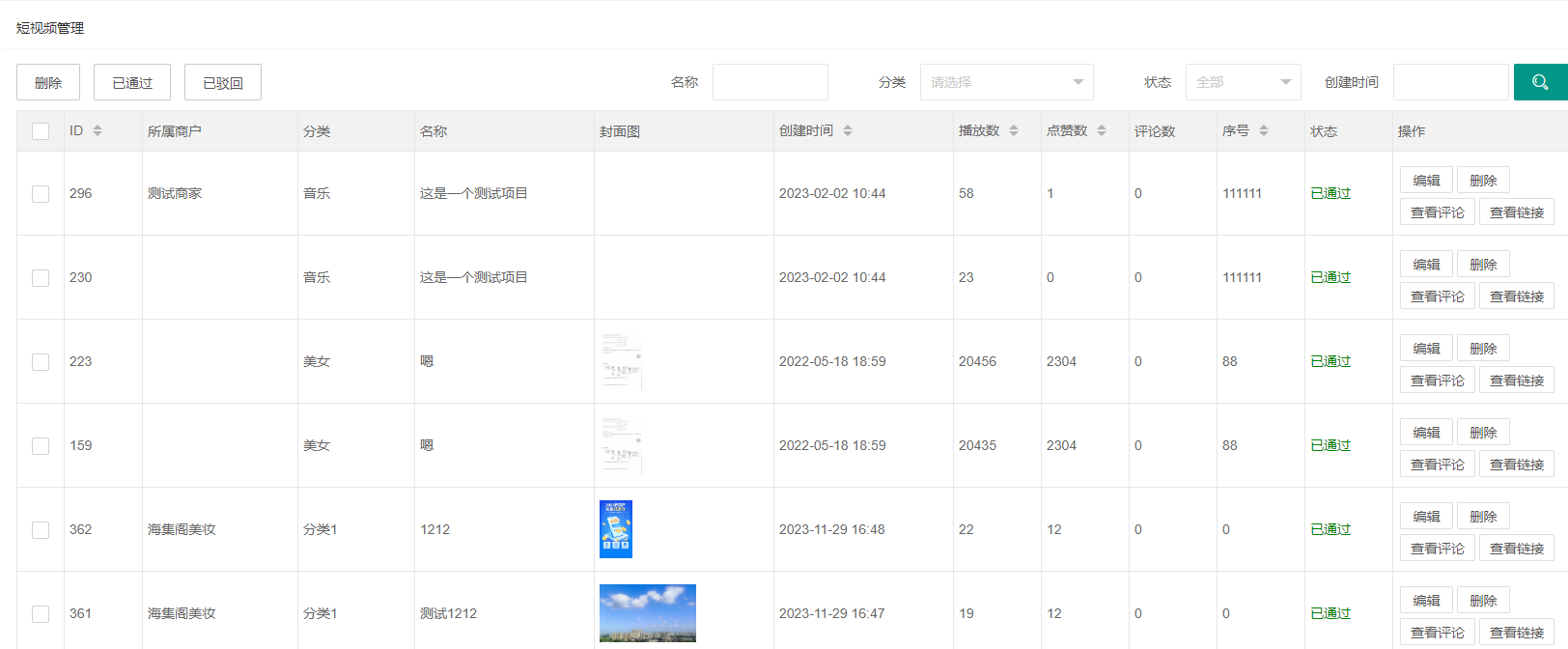 展示多商户的短视频列表,可以对短视频进行删除、通过、驳回、编辑、查看评论、查看链接等操作
