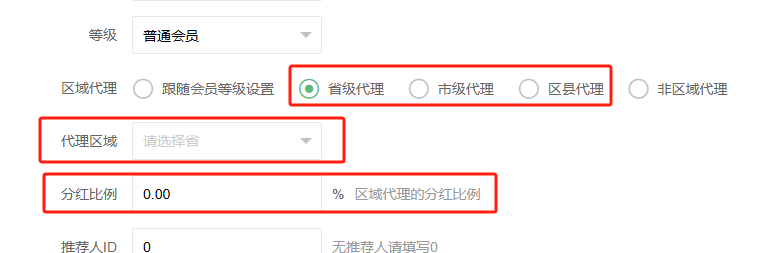 如果在会员等级里单独设置区域代理,自行选项代理区域不跟随会员等级设置,则需要配置代理区域的分红比例