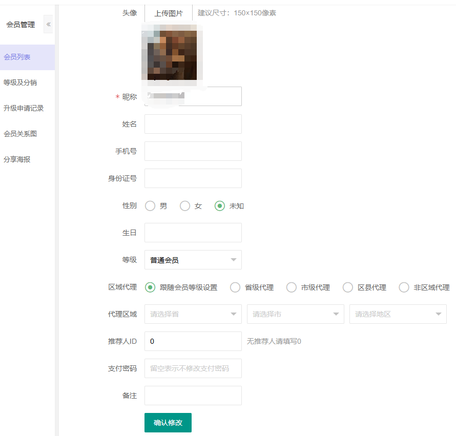可编辑会员头像、昵称、姓名、手机号、身份证号、性别、等级、区域代理、推荐人id、支付密码、备注