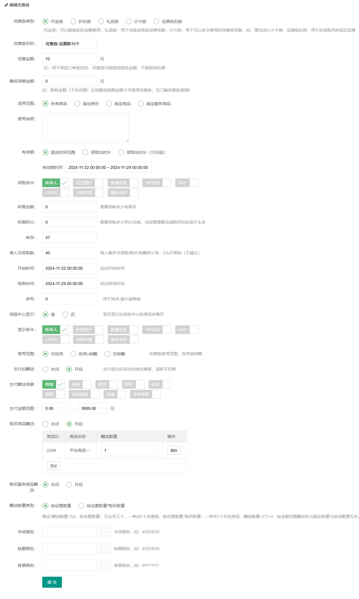添加优惠券:营销——优惠券——添加