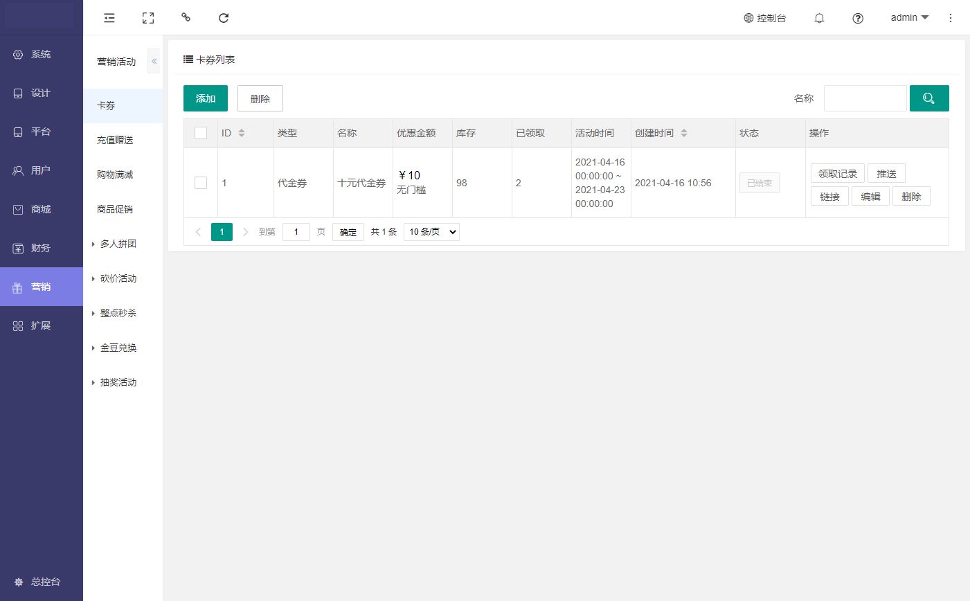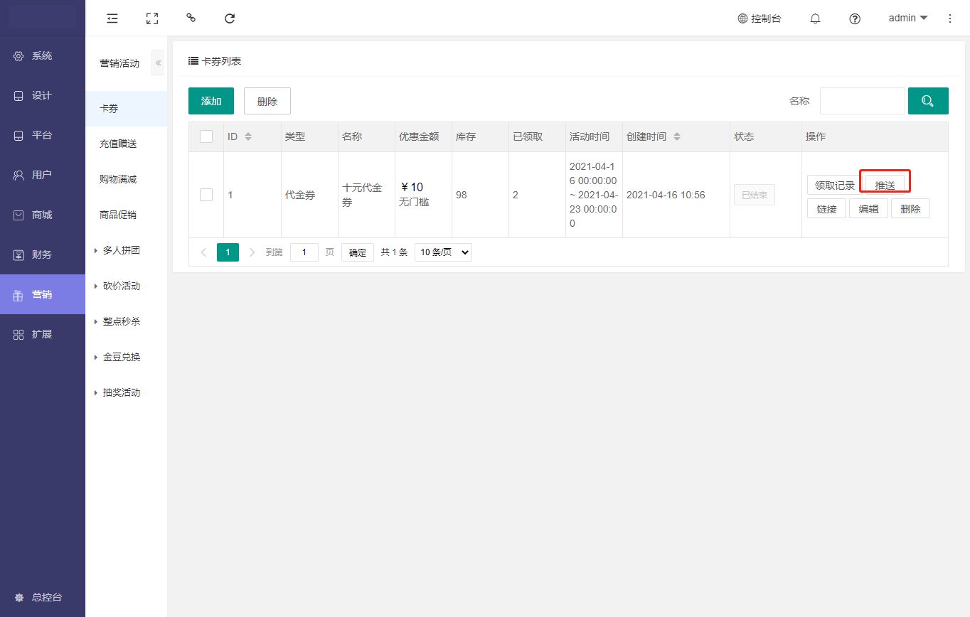 用于商城优惠券的查看,添加,编辑,删除,推送,领取记录查看等操作。