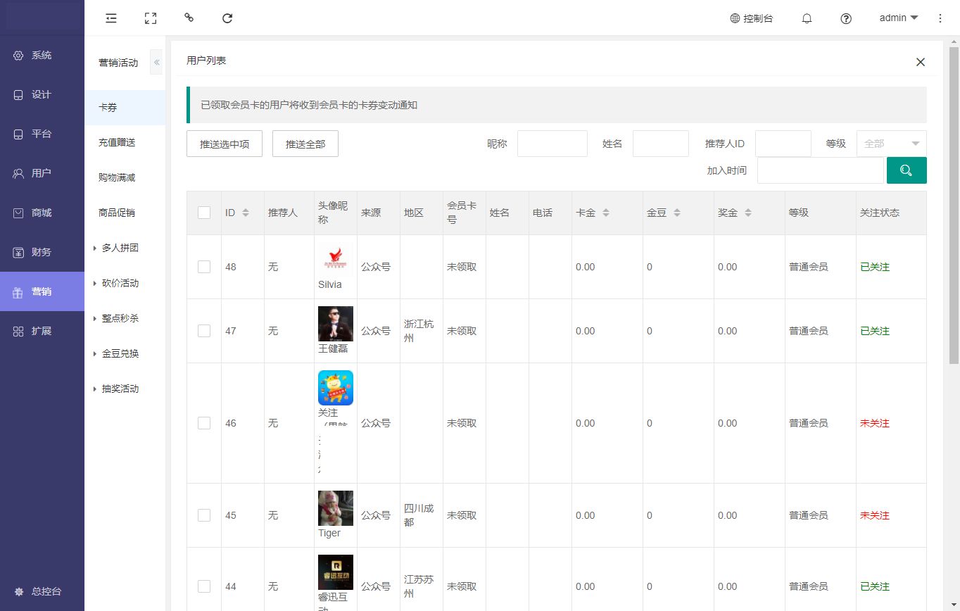 优惠券推送:优惠券可以推送全部会员或者指定会员。