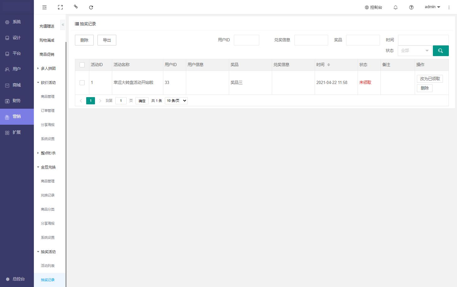 抽奖记录:用于抽奖记录查看,抽奖数据删除,导出筛选等操作,用户领奖后,将领奖状态修改为已领奖。