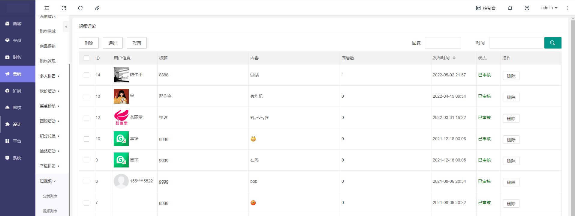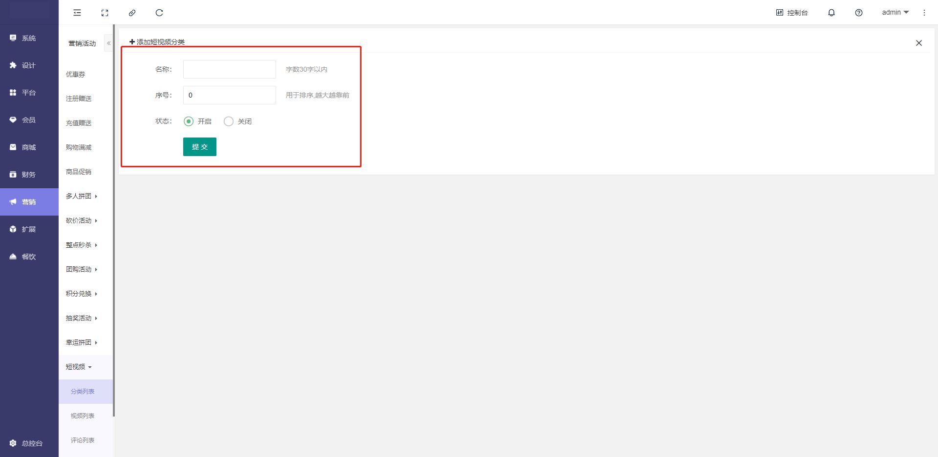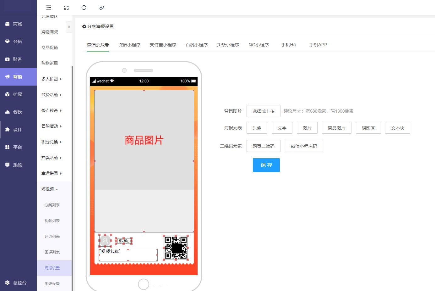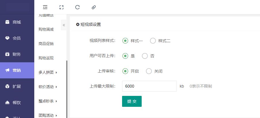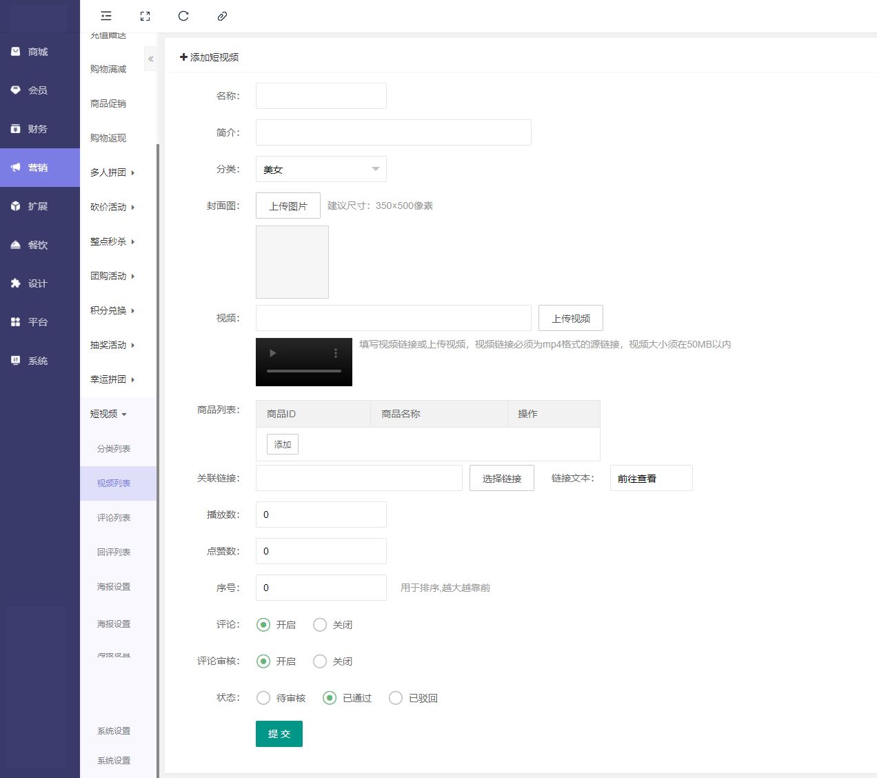 第二步:商城后台——营销——视频列表——添加短视频(注:填写视频链接或上传视频,视频链接必须为mp4格式的源链接,视频大小须在50MB以内)
