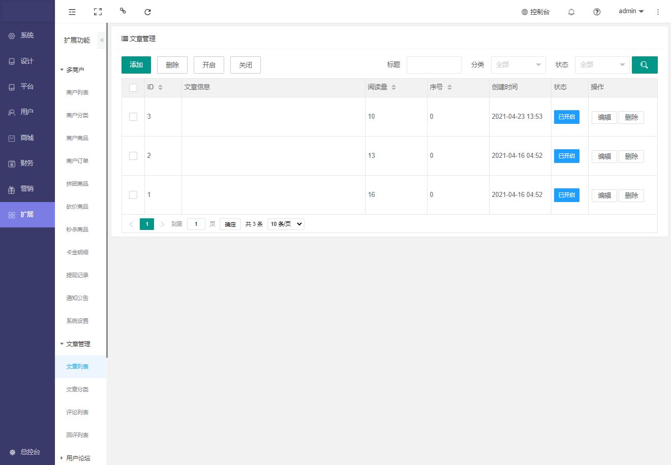 用于文章查看,添加,删除,开启,关闭,筛选等操作。