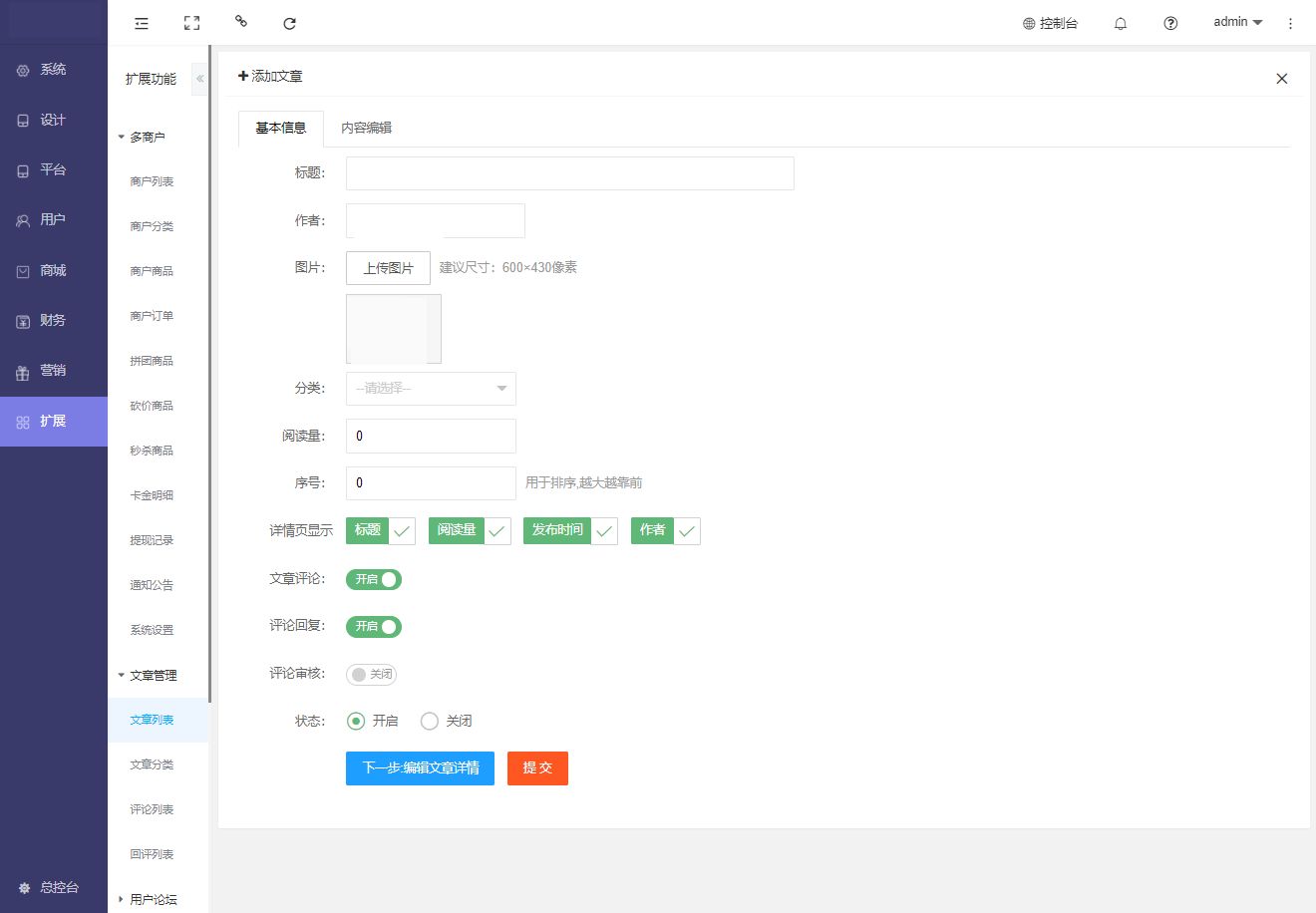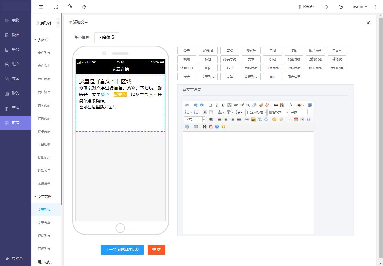 文章添加:扩展——文章管理——文章列表——添加