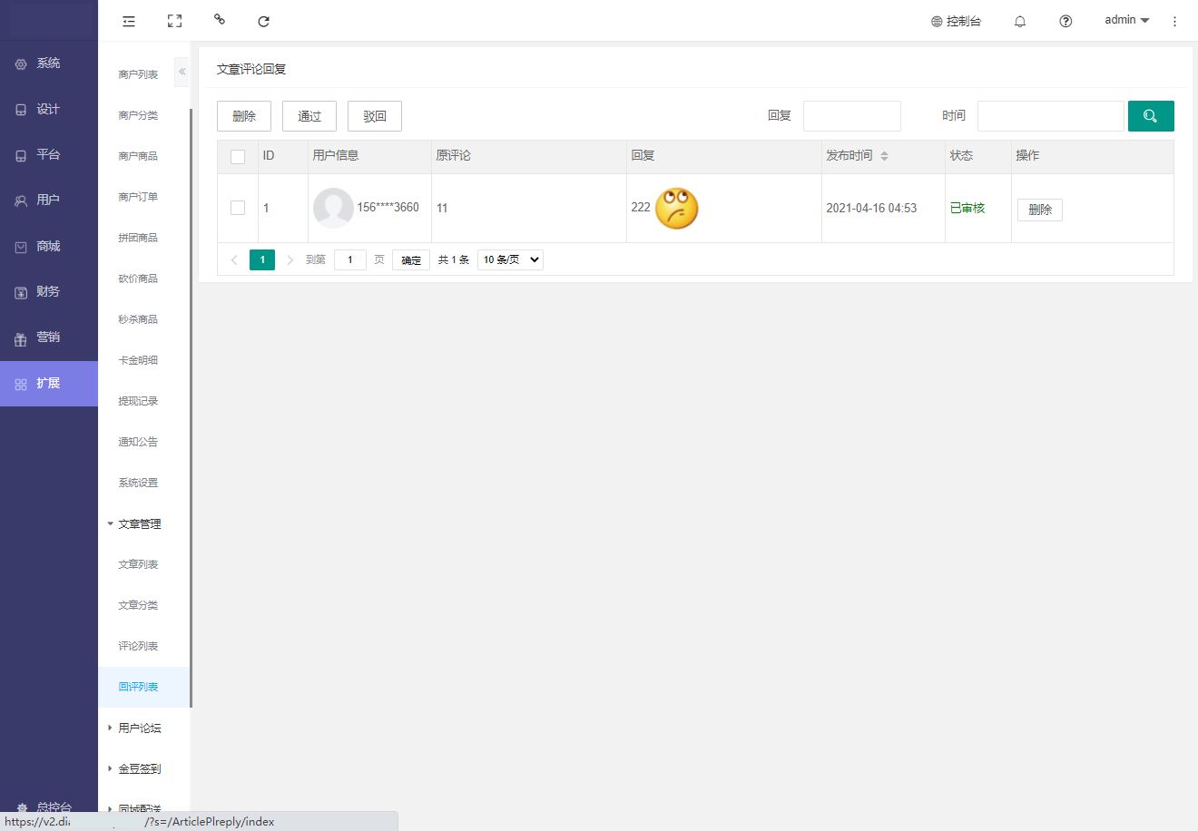 回评列表:用于查看评论的回评,进行回评的删除,审核,查找等操作。