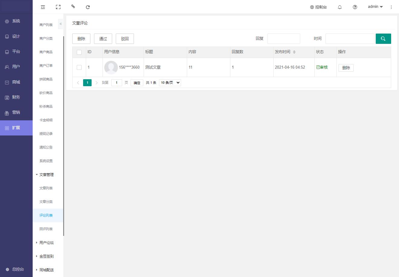 评论列表:用于查看文章评论的删除,审核,查找等操作