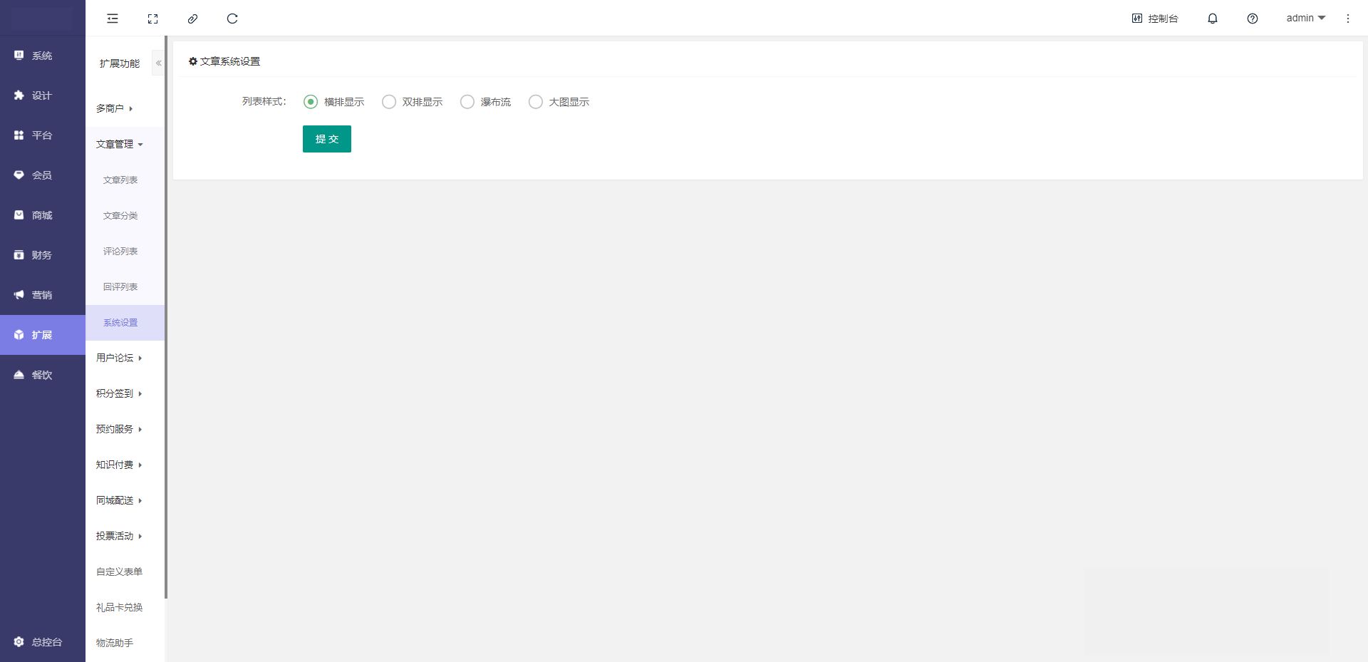 系统设置:列表样式(横排显示、双排显示、瀑布流、大图显示)
