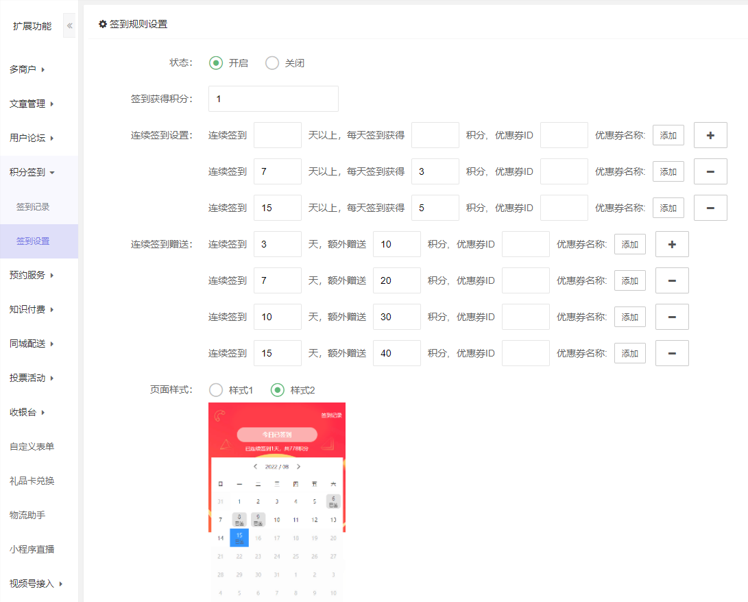 签到获得积分,连续签到奖励,页面样式,签到排名,规则说明