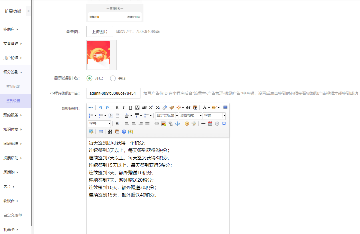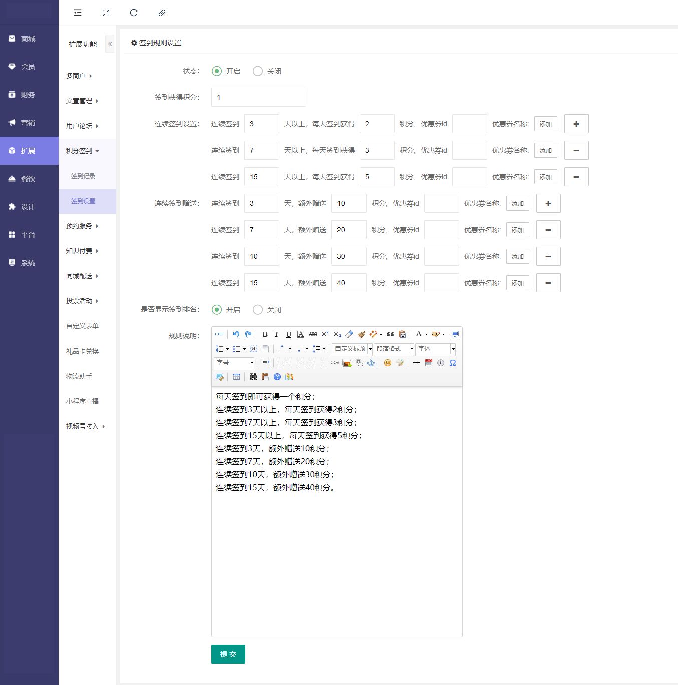 用于积分签到的设置,签到记录查看等操作 设置签到获得积分,连续签到设置,连续签到赠送,签到排名,规则说明