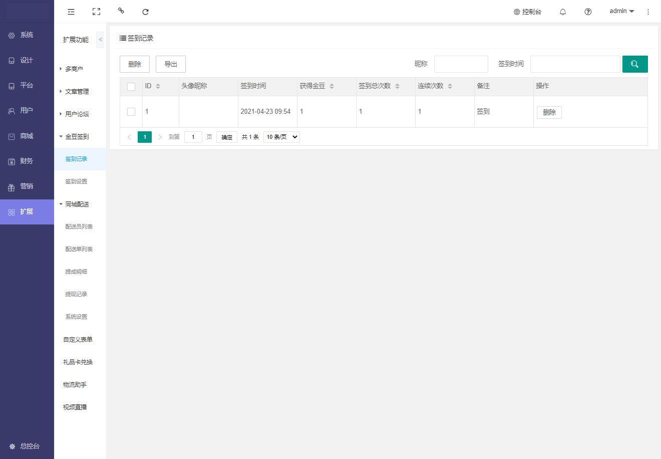 签到记录:用于积分签到记录的查看,删除,导出等操作。