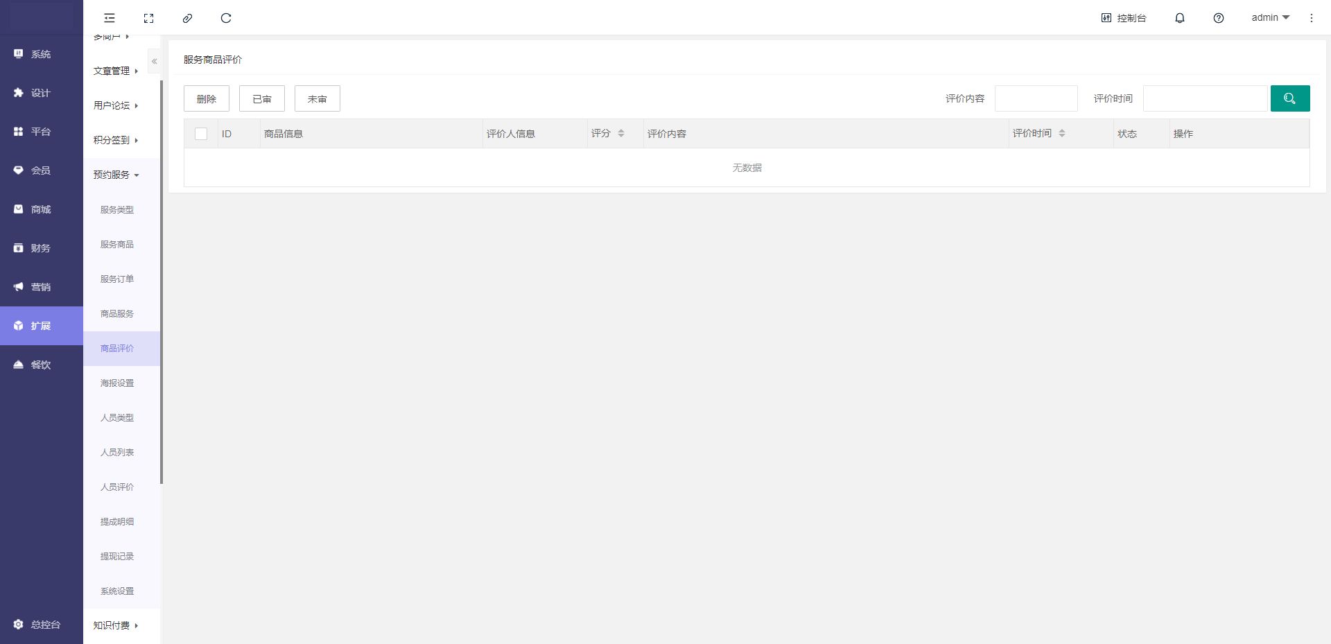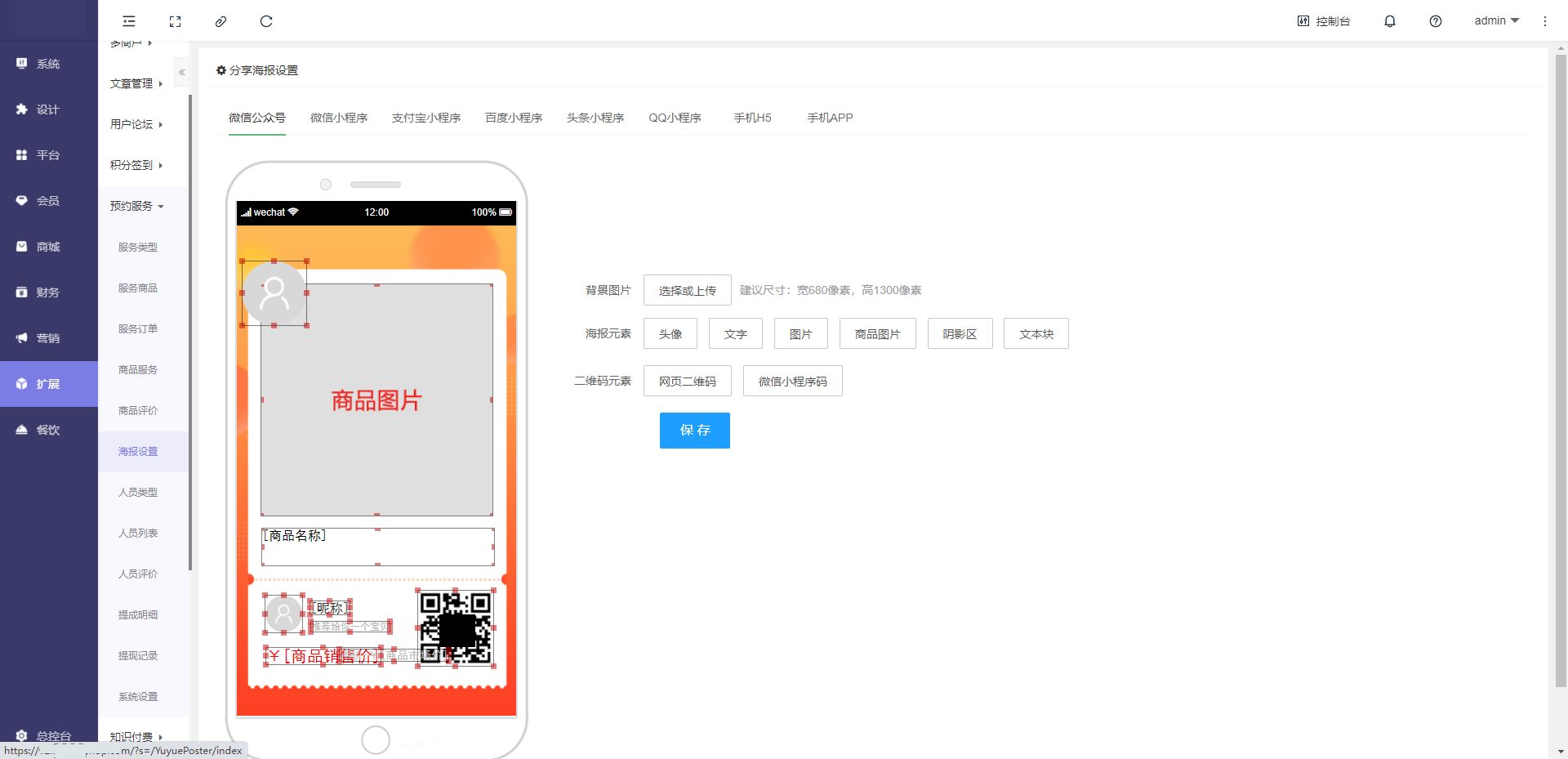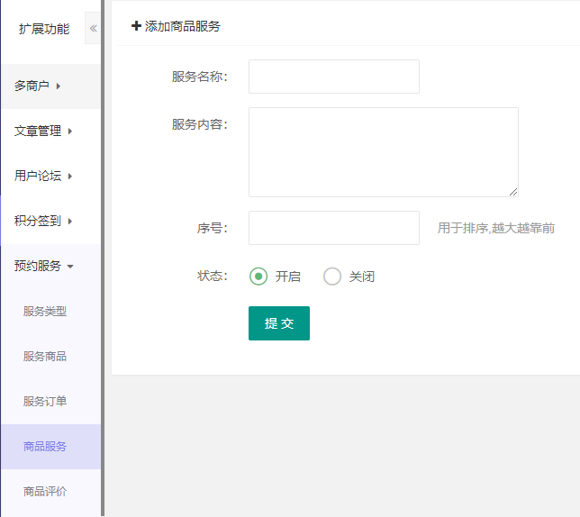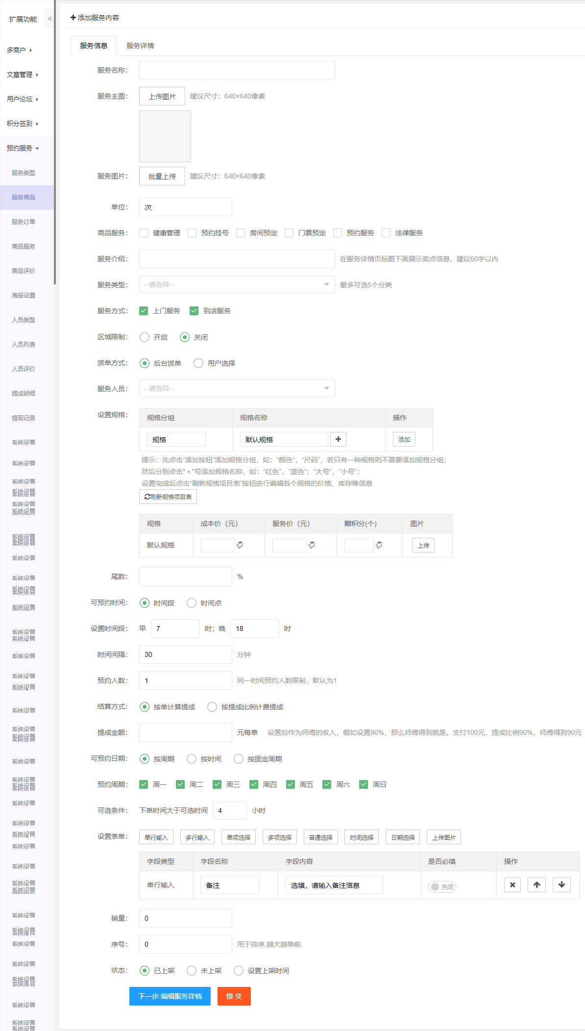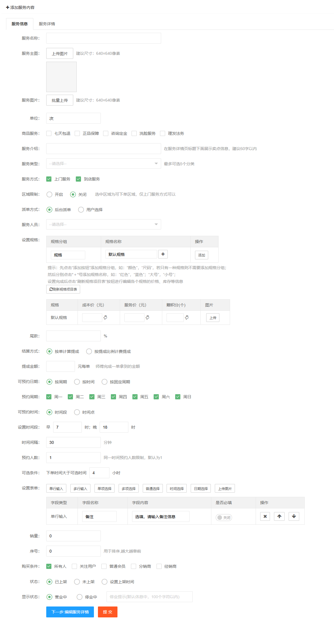 服务商品:添加服务商品,服务名称、服务主图、服务图片、单位、商品服务、服务介绍、服务类型、服务方式、区域限制、派单方式、服务人员、设置规格、尾款、结算方式、提成金额、可预约日期、预约周期、可预约时间、设置时间段、时间间隔、预约人数、可选条件、设置表单、销量、序号、购买条件、状态、显示状态