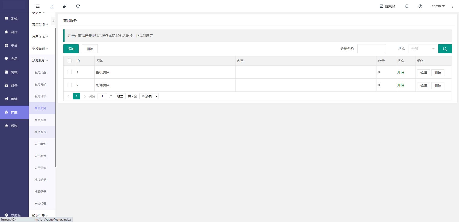 商品服务:用于在商品详情页显示服务标签,如七天退换、正品保障等
