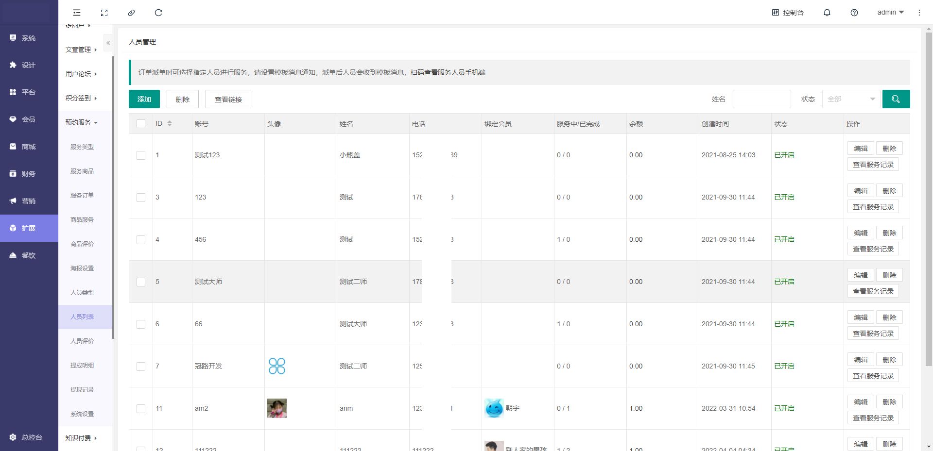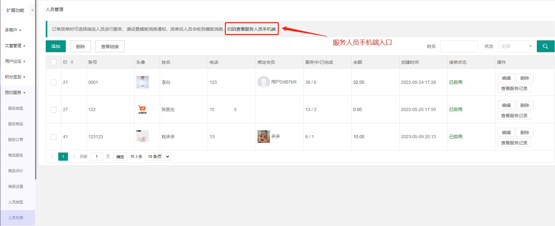 添加服务人员,查看服务人员列表,服务人员手机端入口(人员列表--顶部“扫码查看服务人员手机端”)