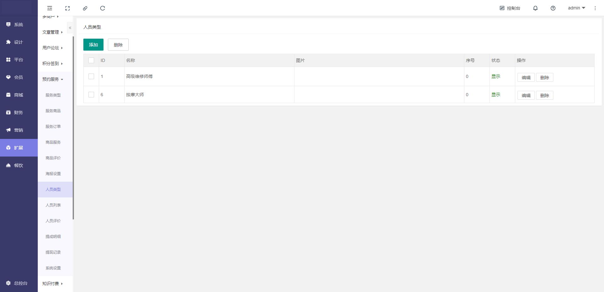 服务类型:添加服务类型:类型名称,图标等,用于添加服务商品时选择;
