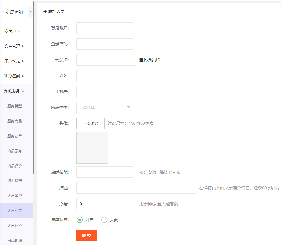 人员列表:订单派单时可选择指定人员进行服务,请设置模板消息通知,派单后人员会收到模板消息