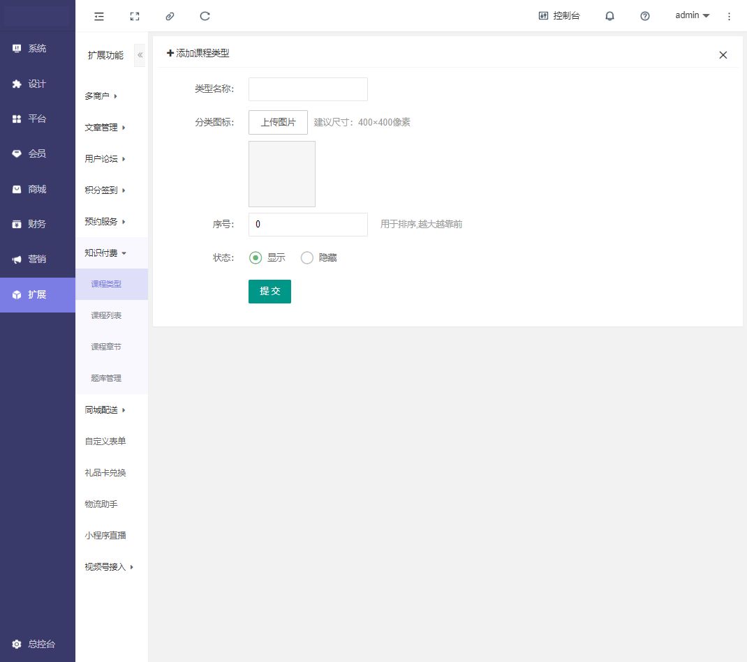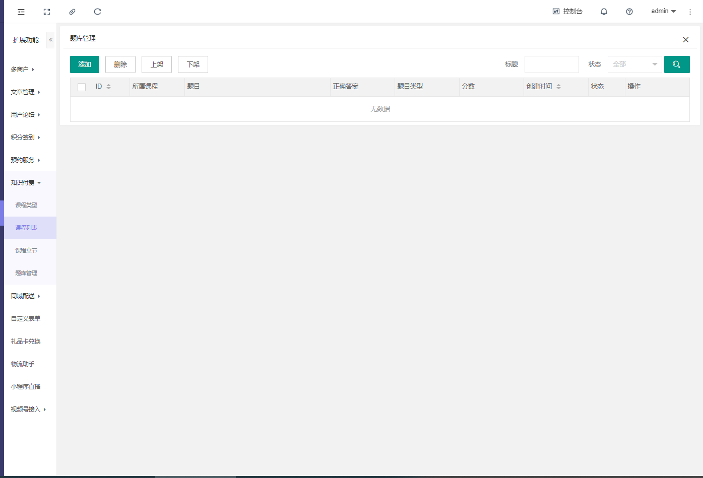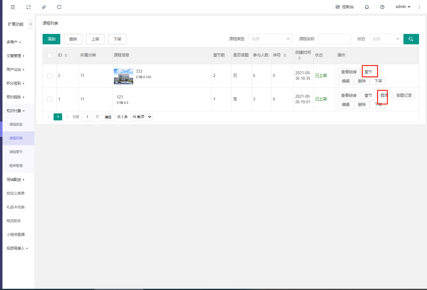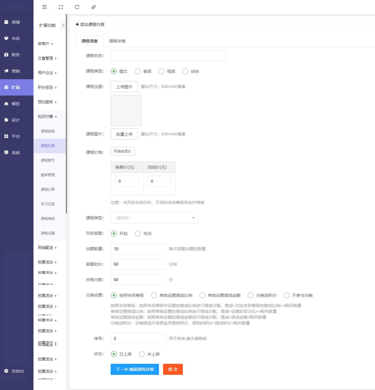 课程列表设置课程信息,课程名称,图片,是否开启会员价格价格,是否开启答题,开启答题后,在章节全部学完后进行答题,答题及格后则不需要在答题,不及格需要继续学习和答题,分销设置(按照会员等级、单独设置提成比例、分销送积分、不参与分销)