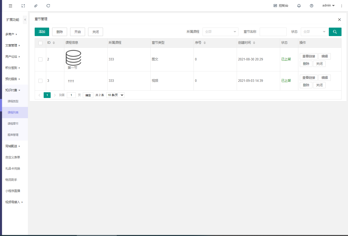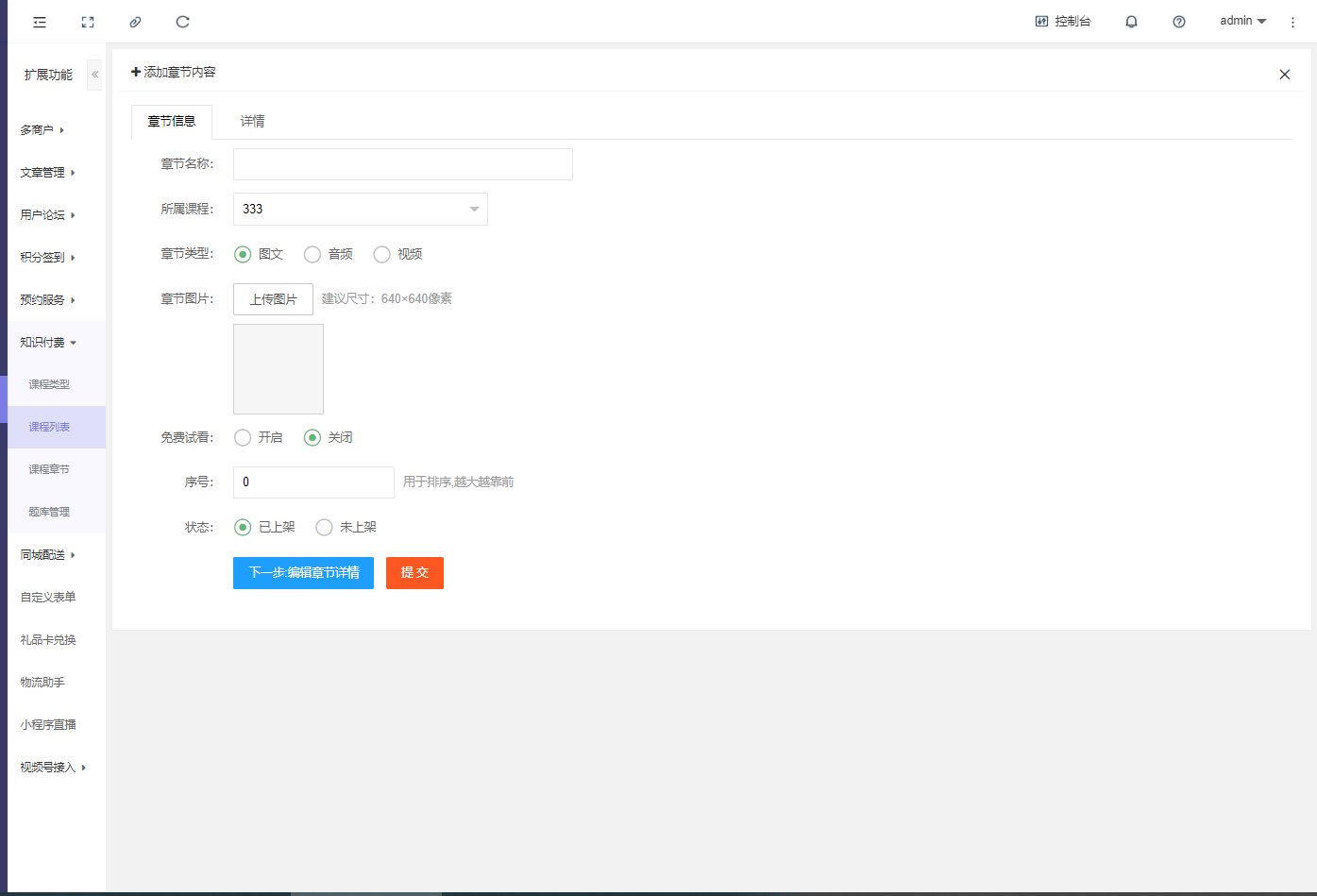 课程 添加完毕,在列表会有章节,答题,点击章节添加课程,可以添加图文,音频,视频