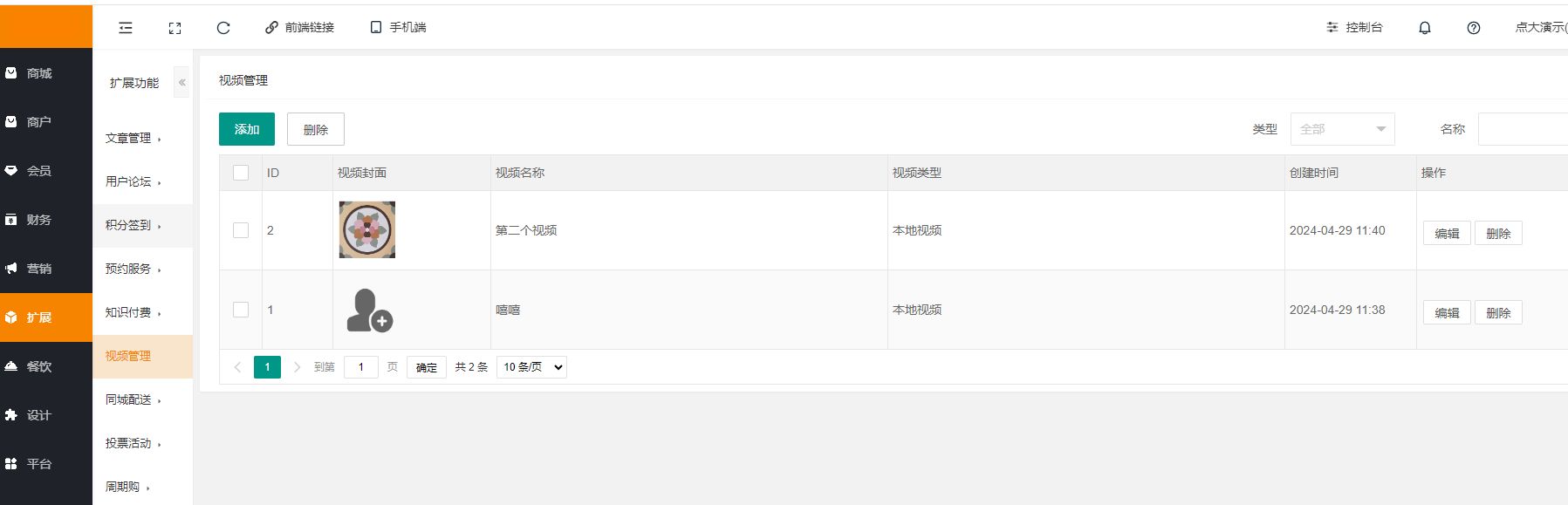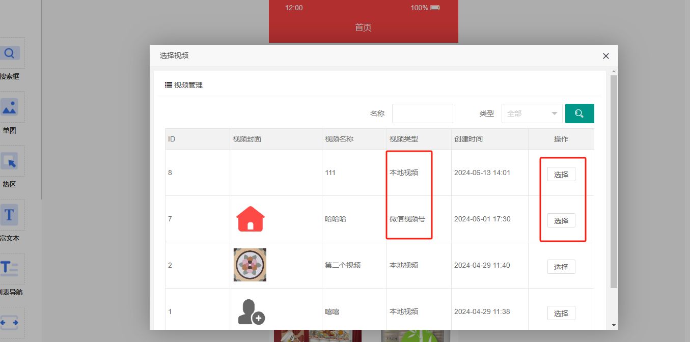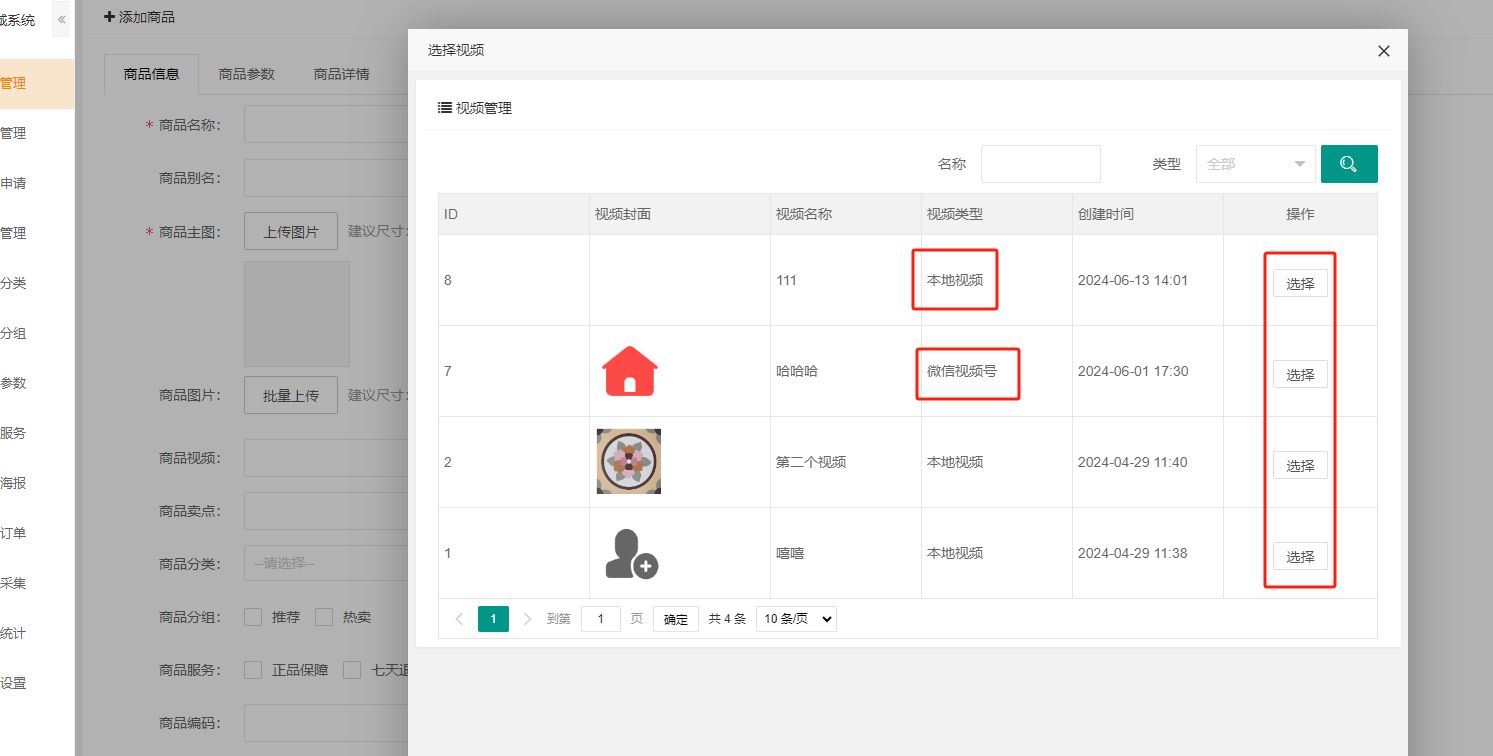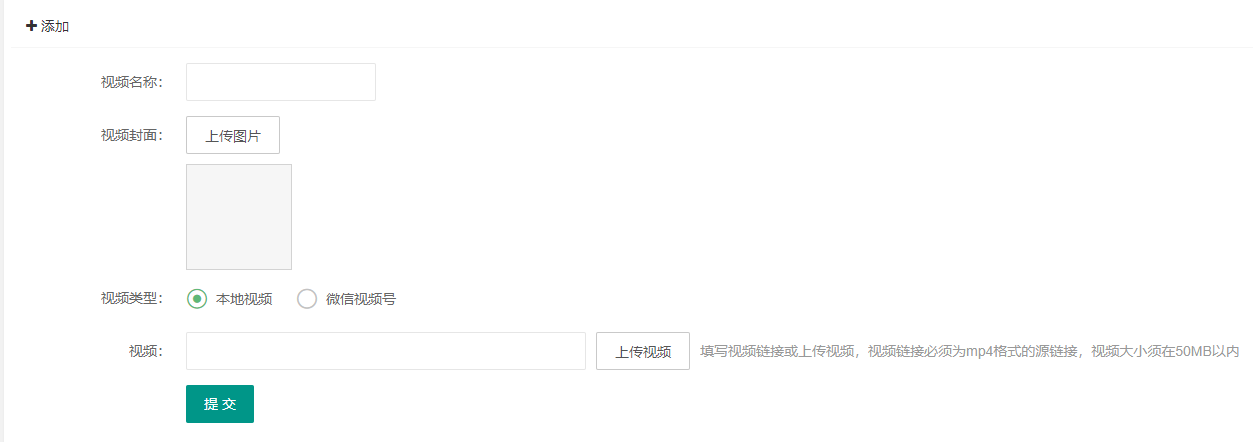 添加视频管理:视频名称、视频封面、视频类型(本地视频、微信视频号)、视频链接