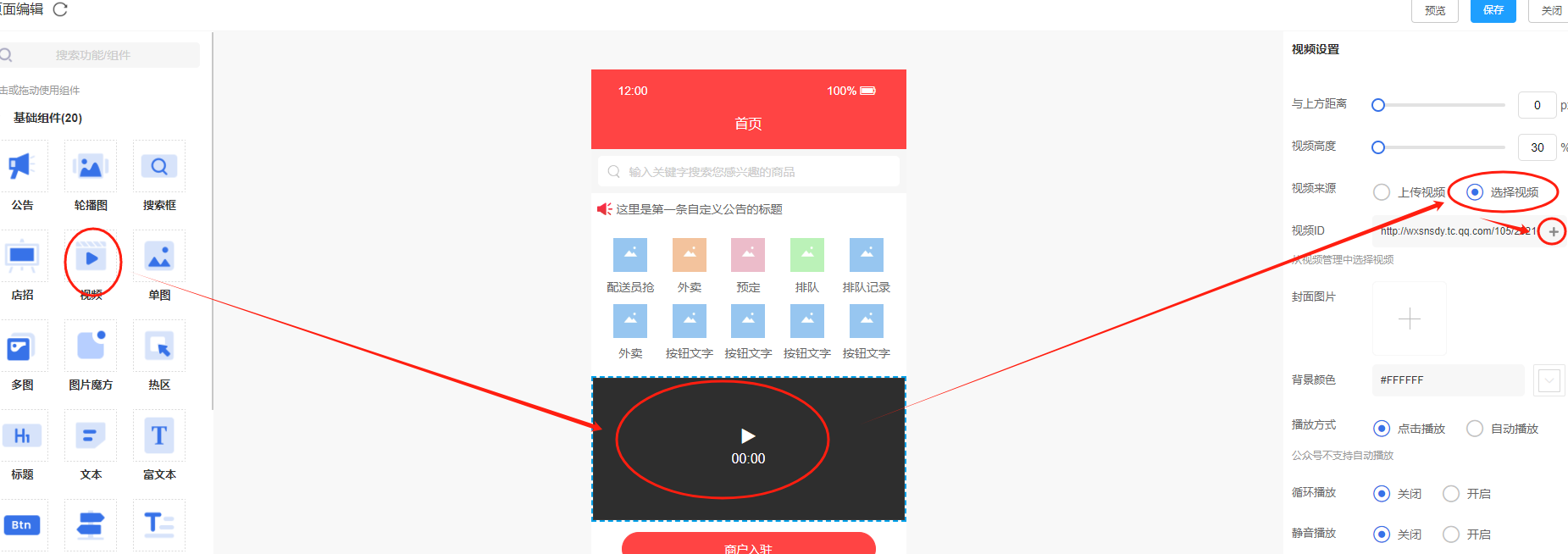 设计页面--编辑---视频组件---右侧视频设置---视频来源---选择视频