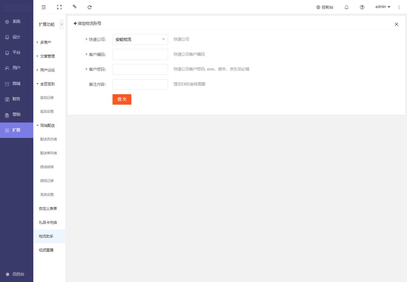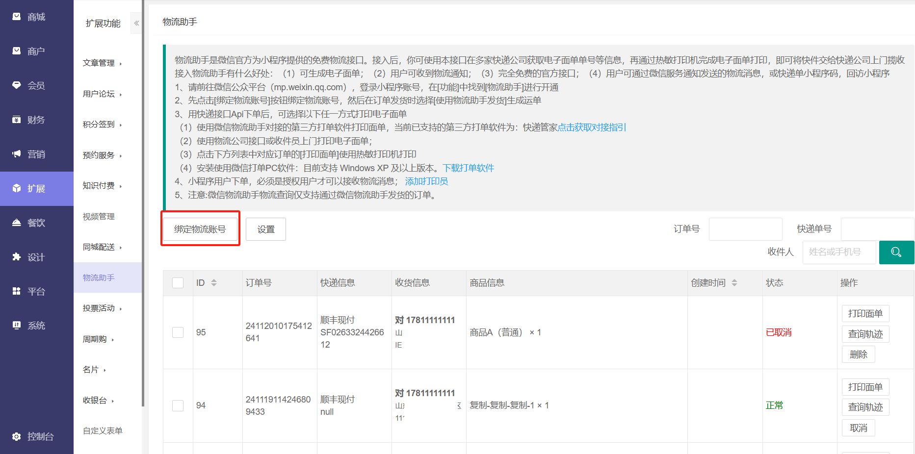 2、先点击[绑定物流账号]按钮绑定物流账号,然后在订单发货时选择[使用物流助手发货]生成运单