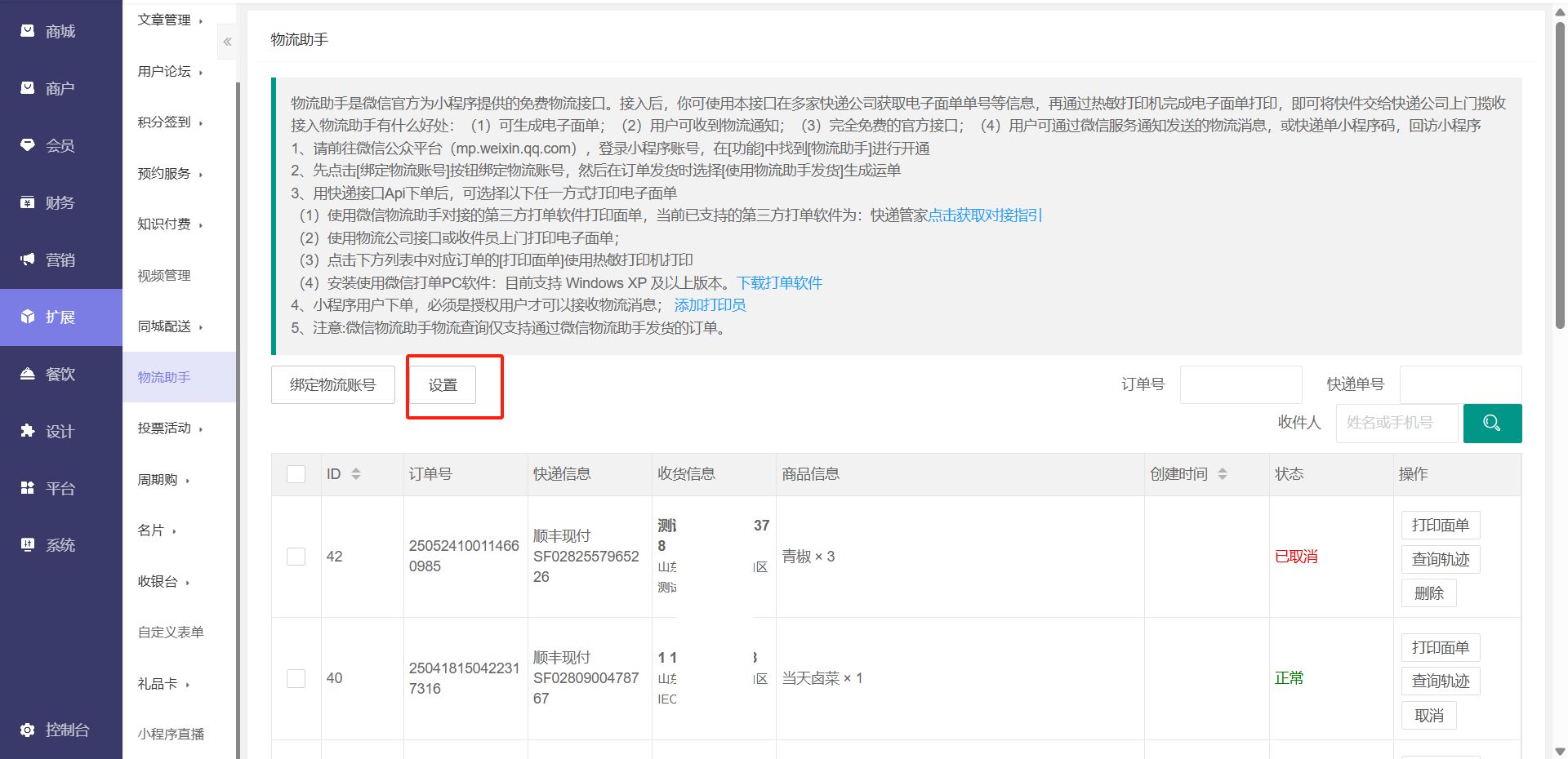 (1)使用微信物流助手对接的第三方打单软件打印面单,当前已支持的第三方打单软件为:快递管家点击获取对接指引