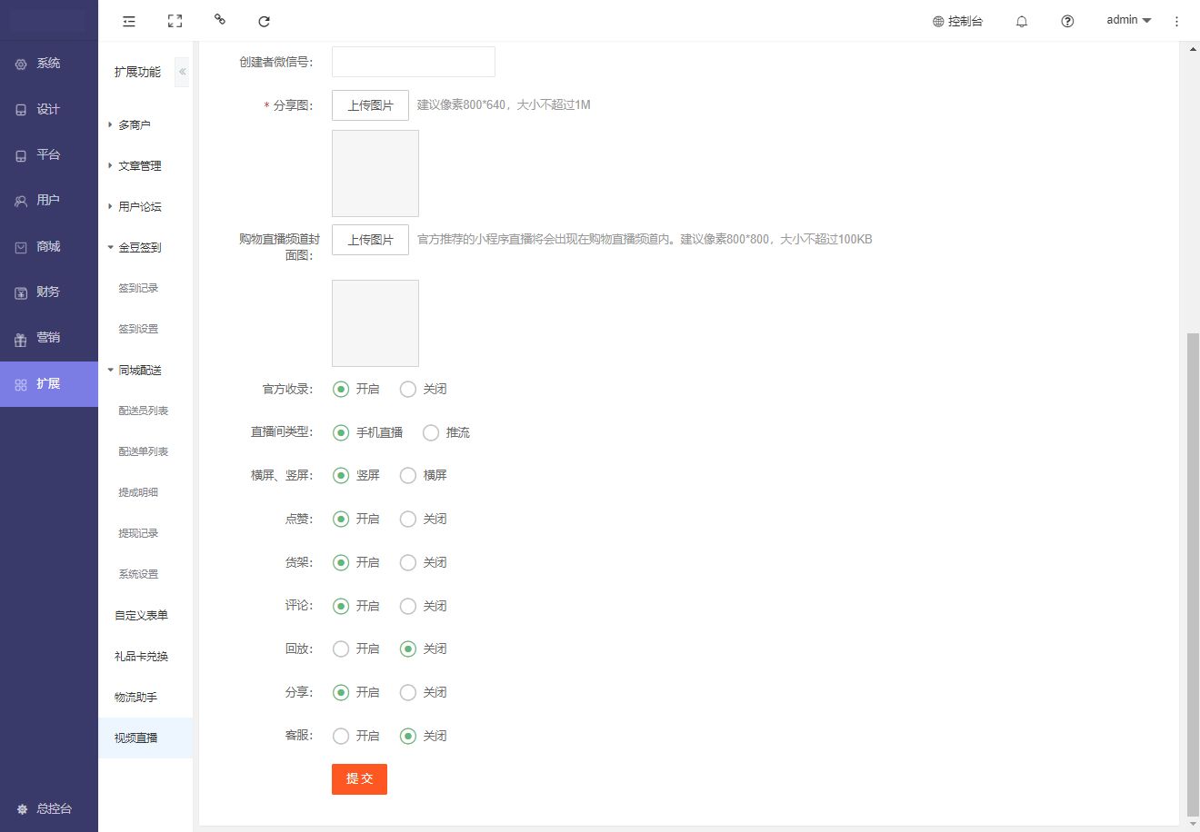 2、直播功能开通后,需要在[系统]-[上传微信审核]中重新上传代码提交审核