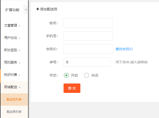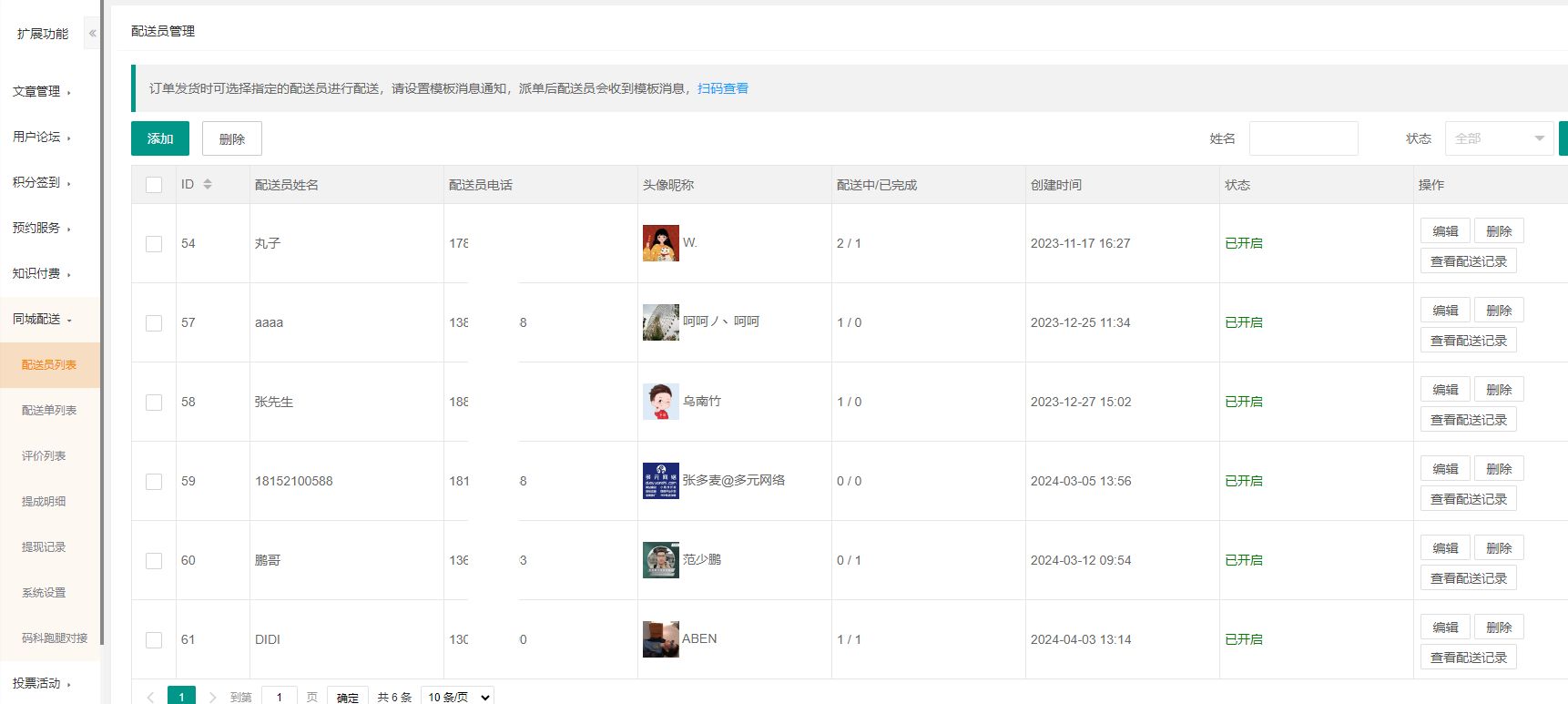 添加配送员,可以对配送员进行编辑,删除,查看配送记录等操作
