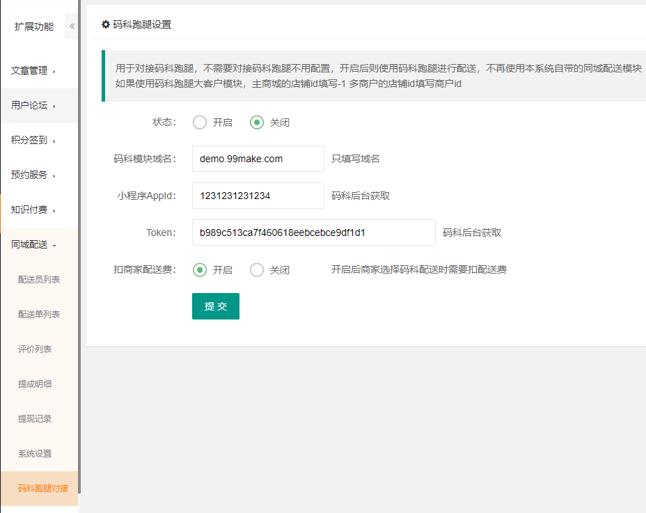 用于对接码科跑腿,不需要对接码科跑腿不用配置,开启后则使用码科跑腿进行配送,不再使用本系统自带的同城配送模块