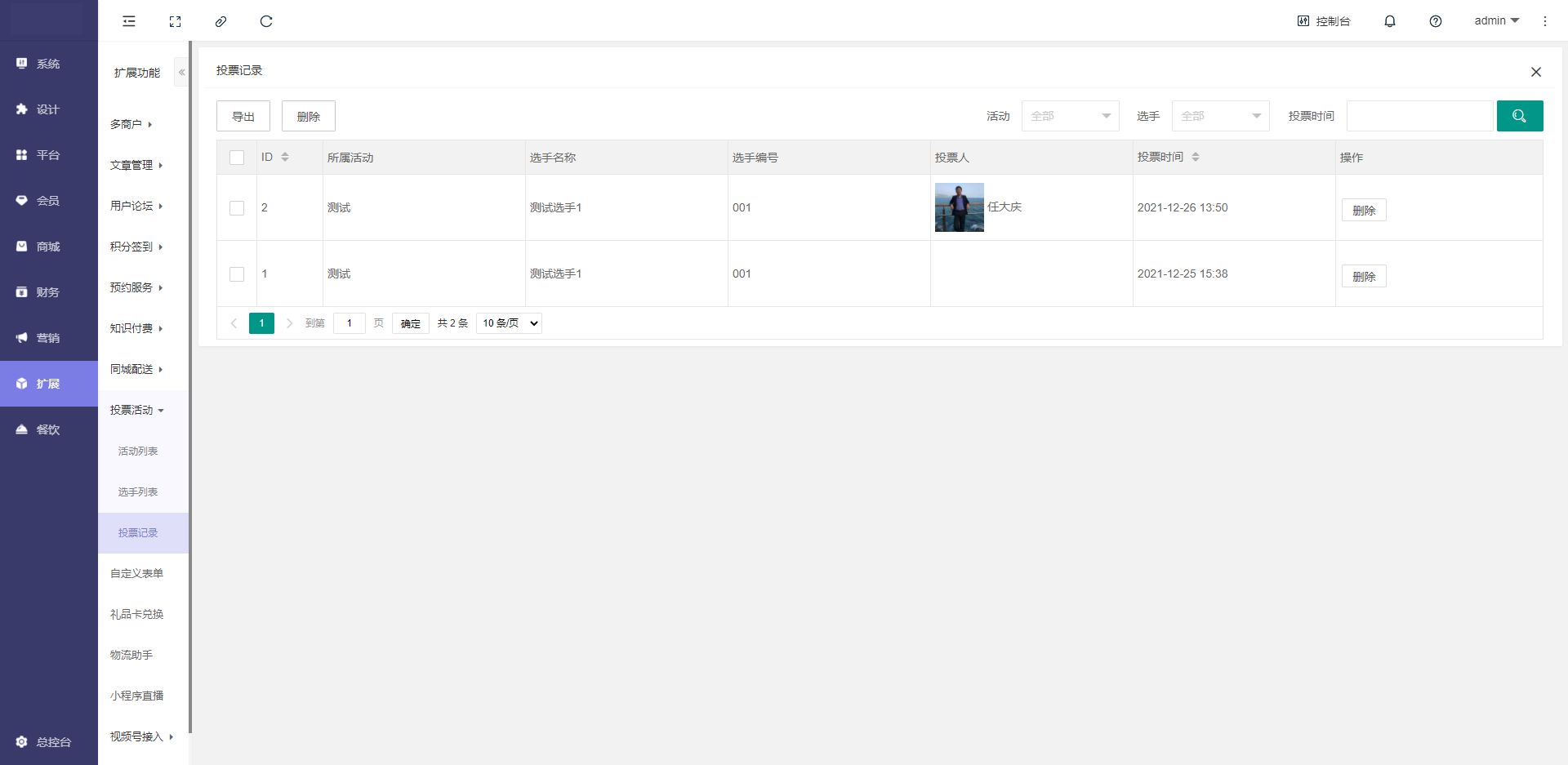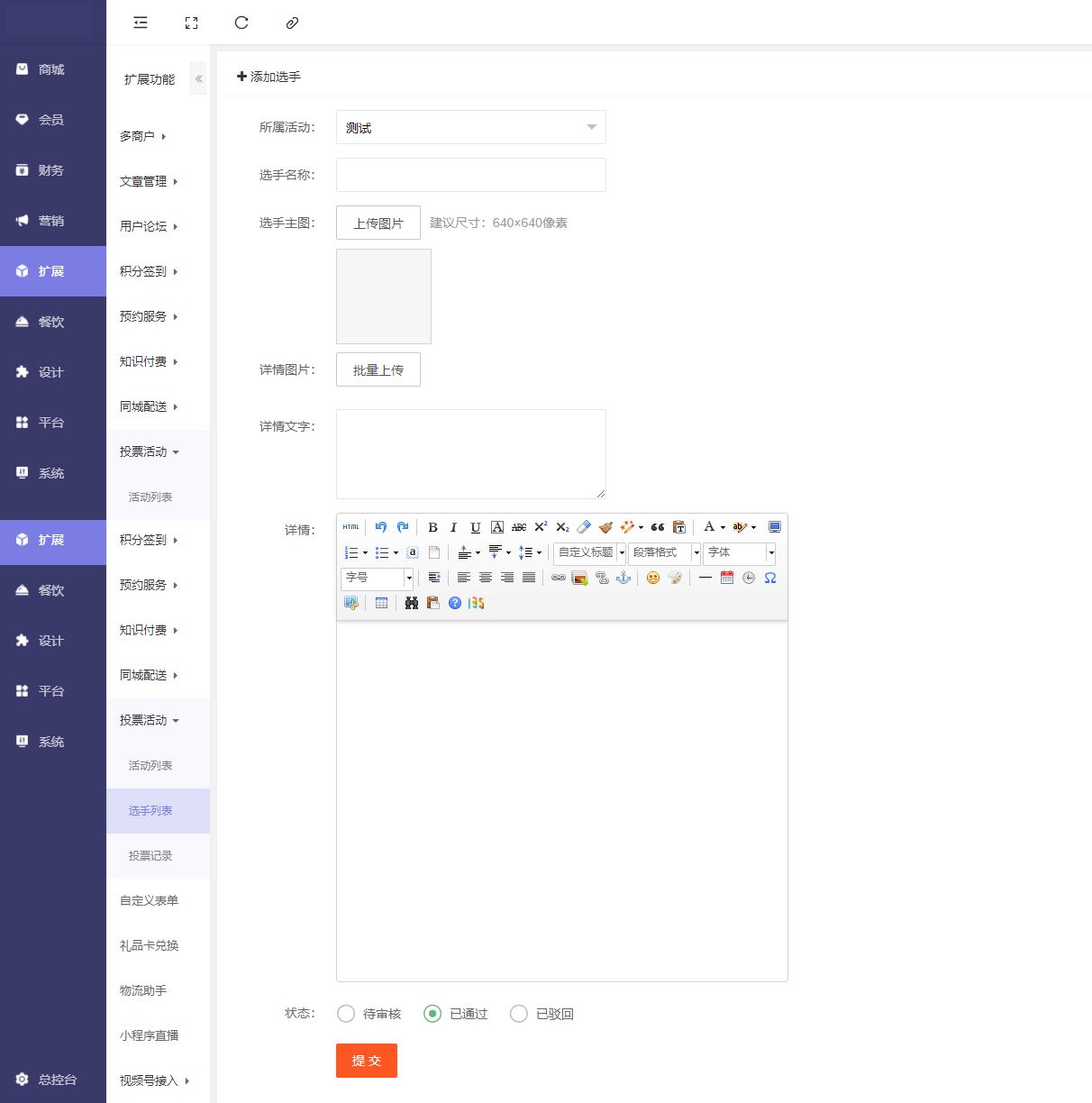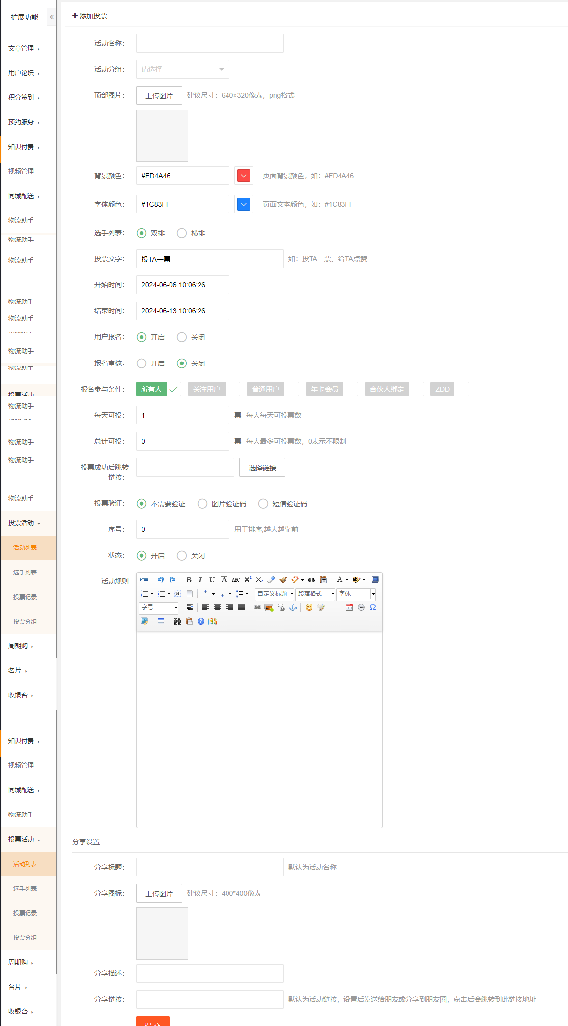 添加投票:填写活动名称、活动分组、顶部图片、背景颜色、字体颜色、选手列表(双排、横排)、投票文字、开始时间、结束时间、用户报名(开启、关闭)、报名审核(开启、关闭)、报名参与条件(所有人、或指定等级)、每天可投票数、总计可投(每人最多可投票数,0表示不限制)、投票成功后跳转链接、投票验证(不需要验证、图片验证码、短信验证码)、序号(用于排序,越大越靠前)、状态(开启、关闭)、活动规则、分享设置