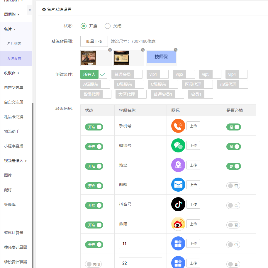 系统设置:设置开启或关闭状态,上传系统背景图,背景/按钮颜色(默认、跟随系统)、前端创建名片时可以使用系统背景图也可以自己上传背景图,创建条件(各个会员等级),联系信息(是否开启,固定字段名称以及自定义名称,图标,是否必填)