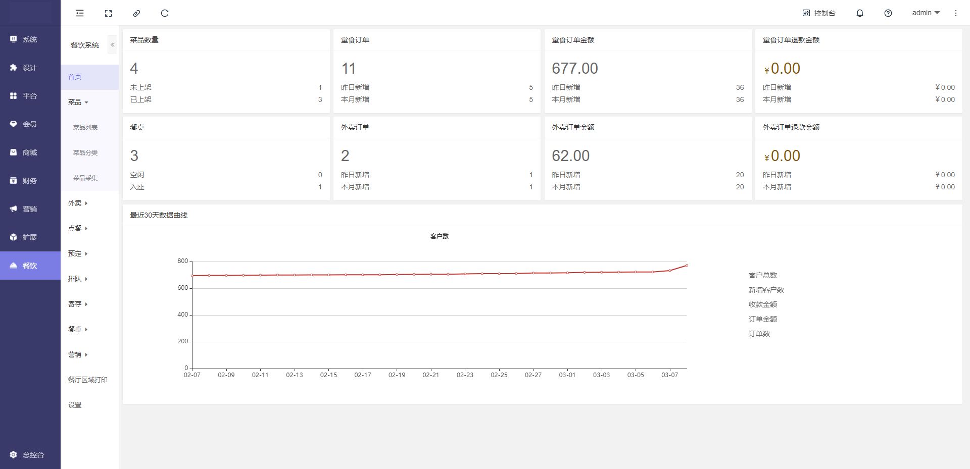 用于展示菜品数量,堂食订单,堂食订单金额,堂食订单退款金额,餐桌,外卖订单,外卖订单金额,外卖订单退款金额,最近30天数据曲线等信息