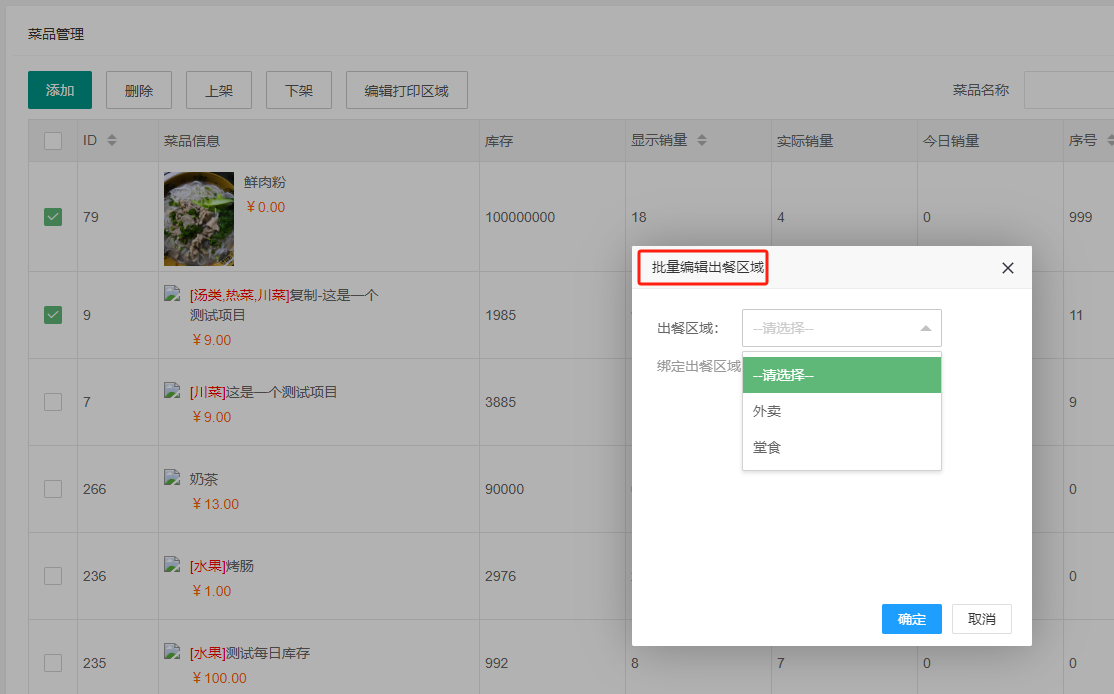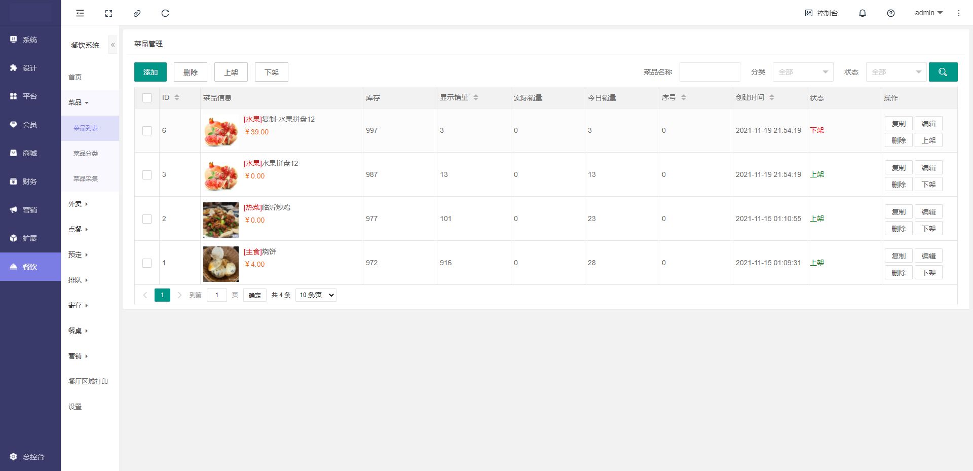用于查看菜品、添加菜品、删除菜品、上架菜品,下架菜品,筛选菜品、编辑菜品信息等