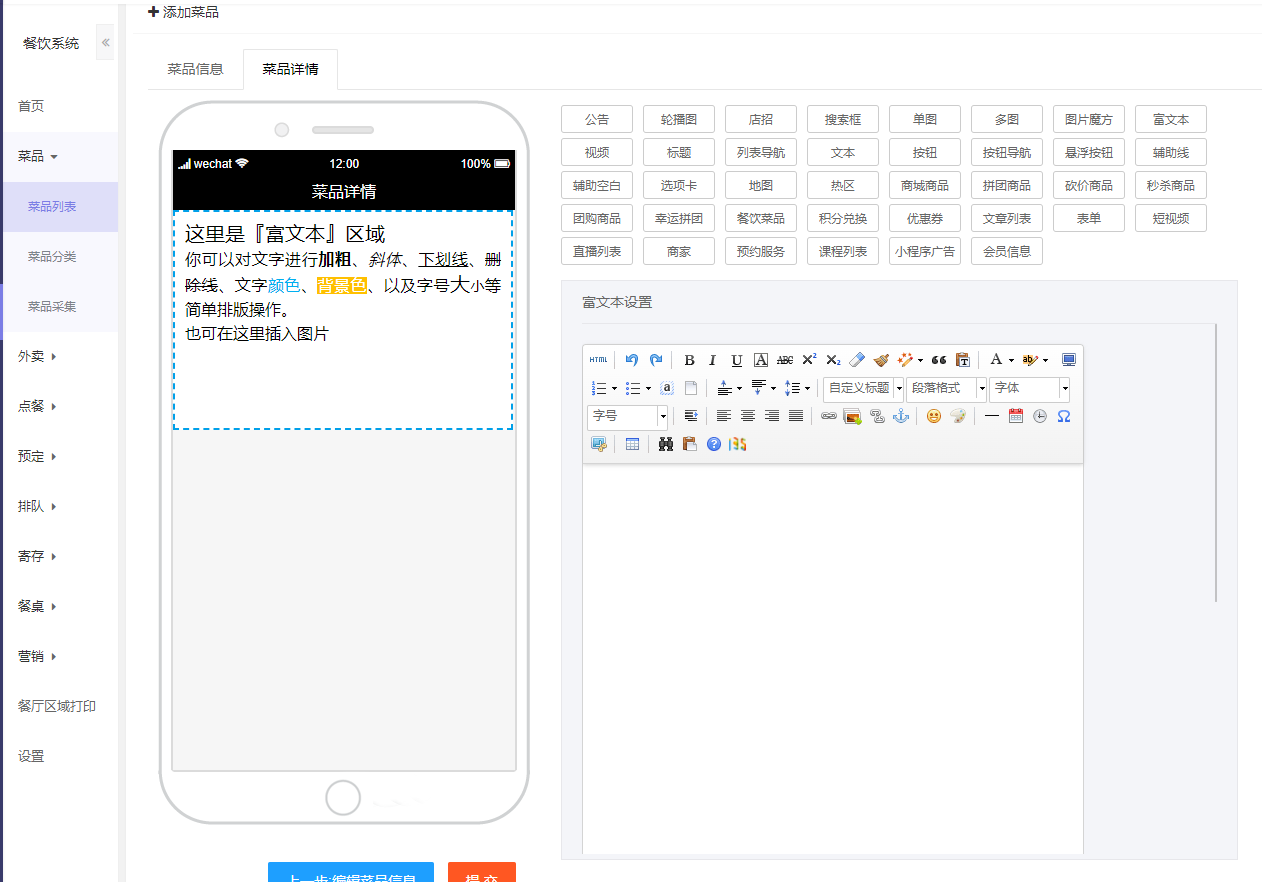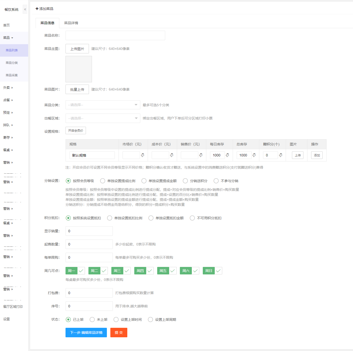 添加菜品步骤:餐饮——菜品——菜品管理——添加菜品(菜品名称、分类、出餐区域、菜品图片、价格(原价、现价)、库存、减库存方式、用户单次最多购买量、起售数量、销量、赠送积分、积分抵扣、分销设置、周几点餐等;)