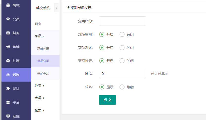 添加分类:餐饮——菜品——菜品分类——添加分类(分类名称、是否支持店内、是否支持外卖、是否支持预定)