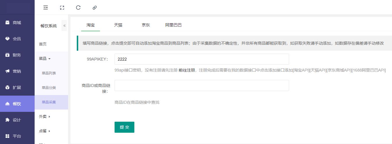 填写商品链接,点击提交即可自动添加淘宝商品到商品列表;由于采集数据的不确定性,并非所有商品都能获取到,如获取失败请手动添加,如数据存在偏差请手动修改