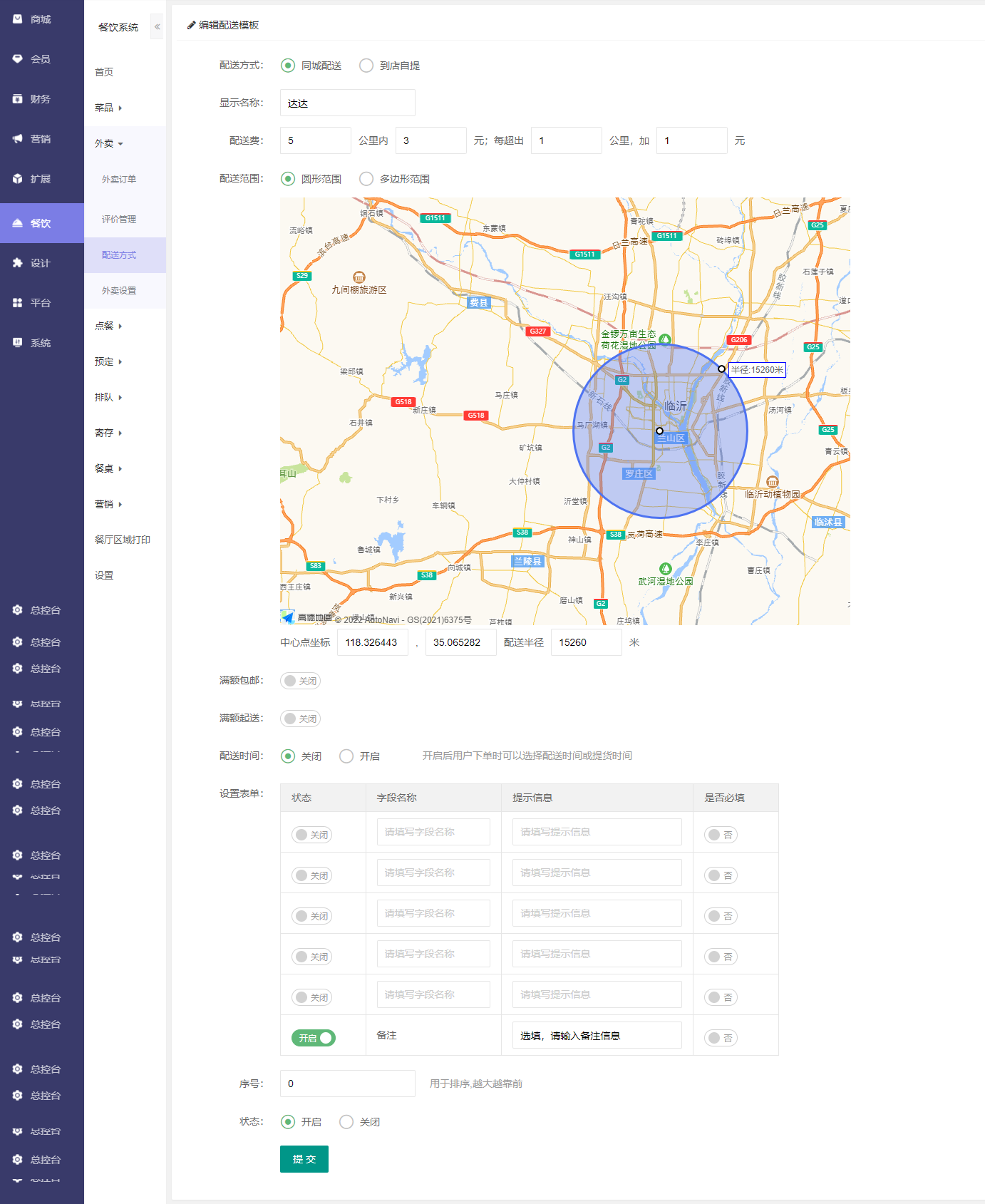 同城配送:设置名称,设置配送费,公里内价格,以及每超出的价格,设置配送范围,圆形范围或方形范围,设置满额包邮,设置满额起送,是否开启配送时间开启后用户下单时可以选择配送时间或提货时间。设置表单,表单开启,下单时必填。