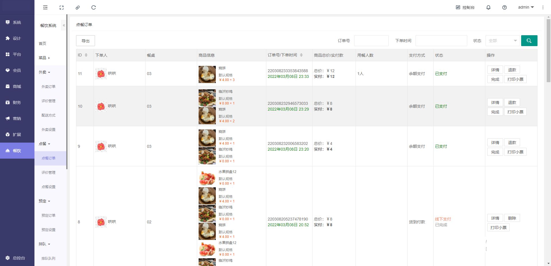 用于查看点餐订单,订单详情,可通过订单号、下单时间、状态进行检索查询