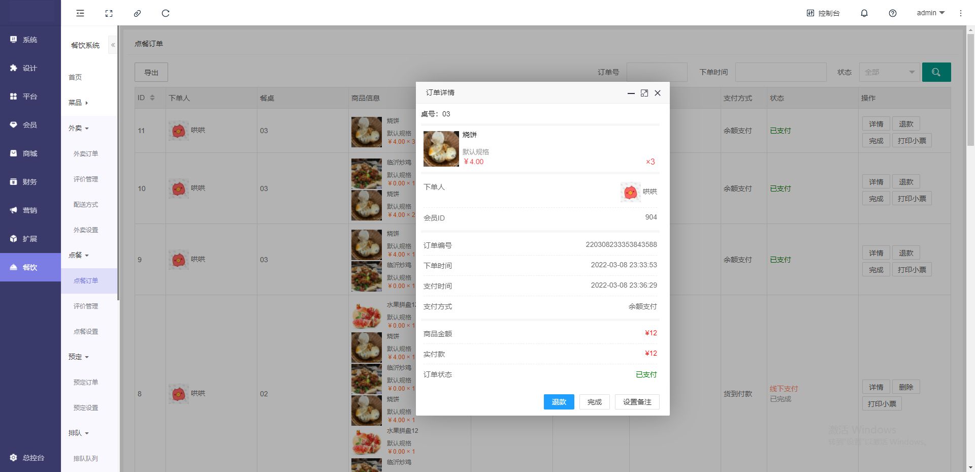 管理员也可以通过手机端后台给客户点餐: