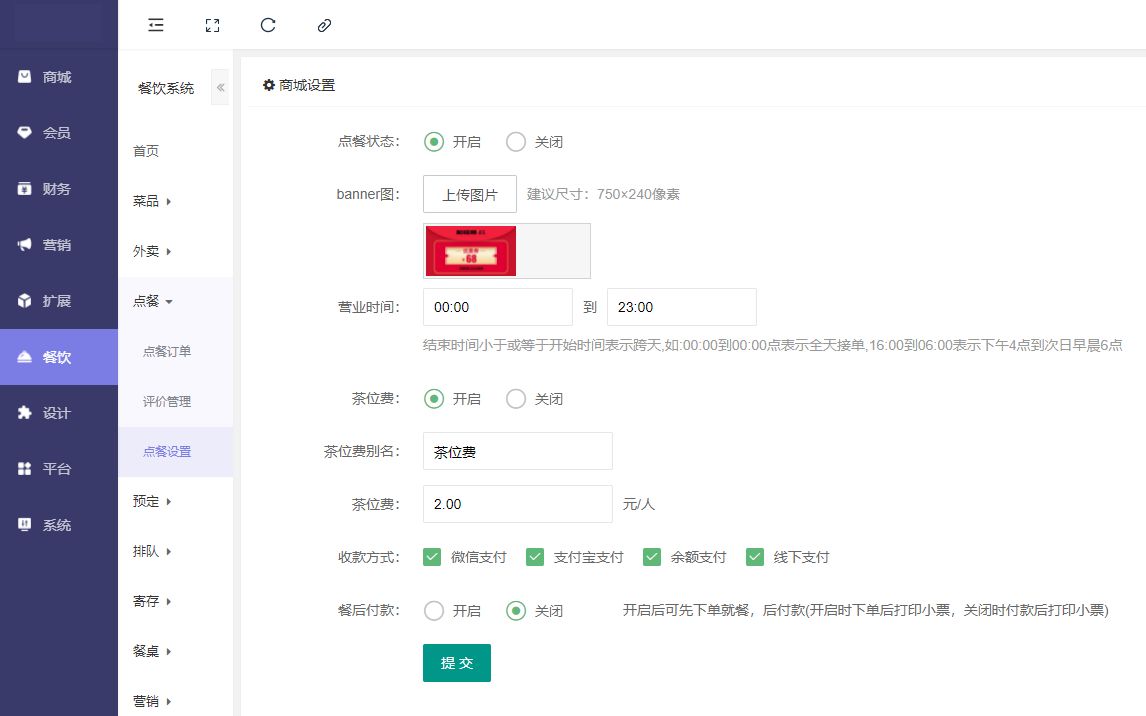 点餐设置是否开启,设置收款方式:微信支付,支付宝支付,余额支付,线下支付