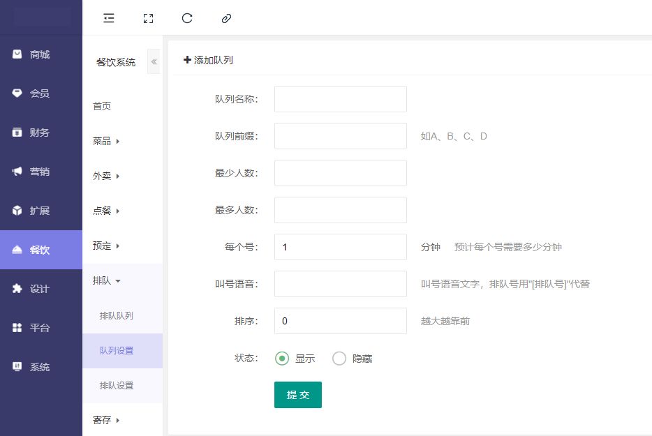 添加队列名称、前缀、设置队列最少人数、最多人数、预计每个号需要多少分钟、叫号语音文字,排队号用"[排队号]"代替