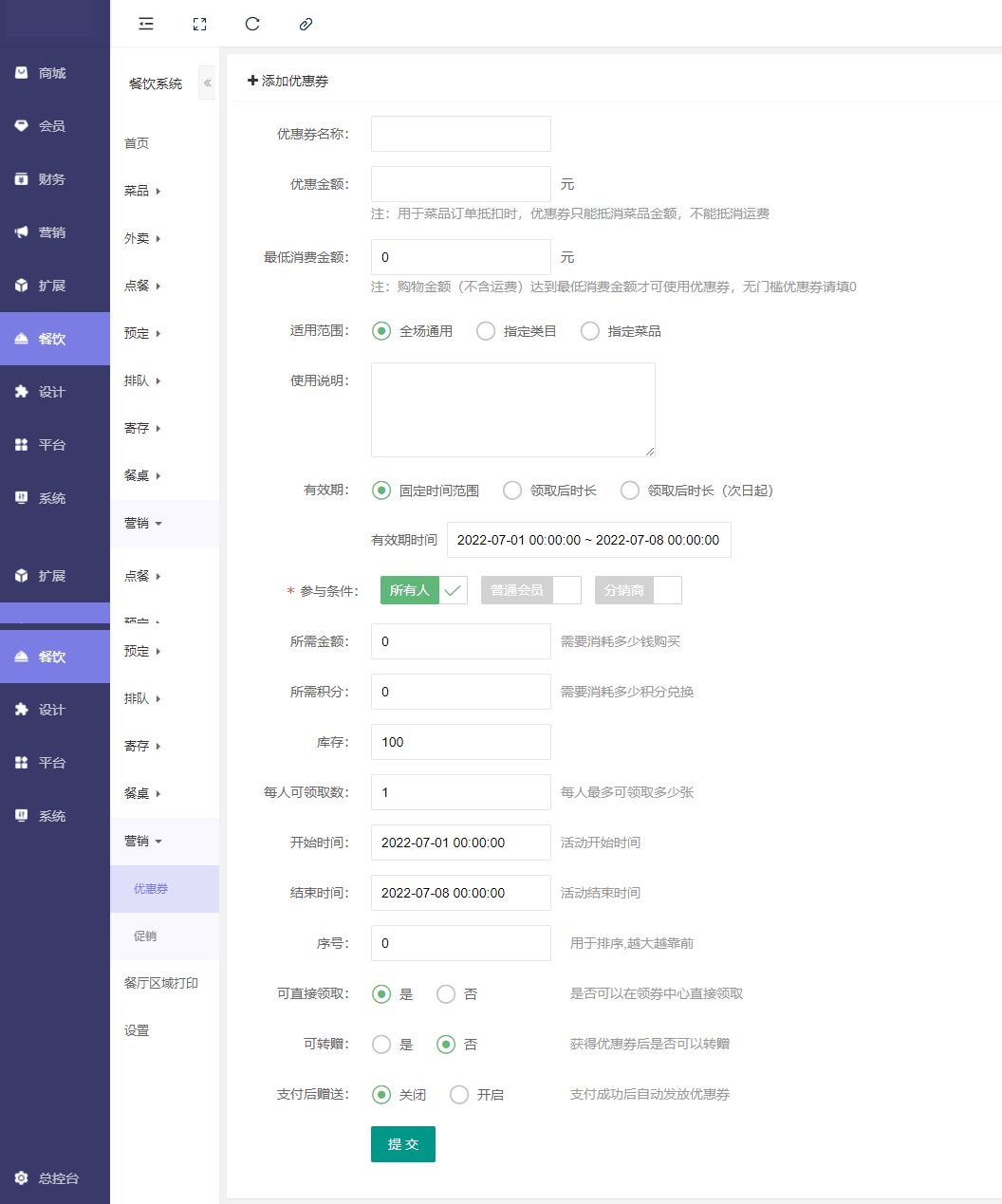 添加优惠券:设置优惠券名称,优惠金额,最低消费金额,适用范围(全场通用;指定类目;指定菜品),填写使用说明,设置有效期(固定有效时间;领取时长;领取后时长),参与条件,所需金额,所需积分,库存,每人可领取数,开始时间,结束时间,序号,可直接领取(是否可以在领券中心直接领取),可转赠(获得优惠券后是否可以转赠),支付后赠送(支付成功后自动发放优惠券)
